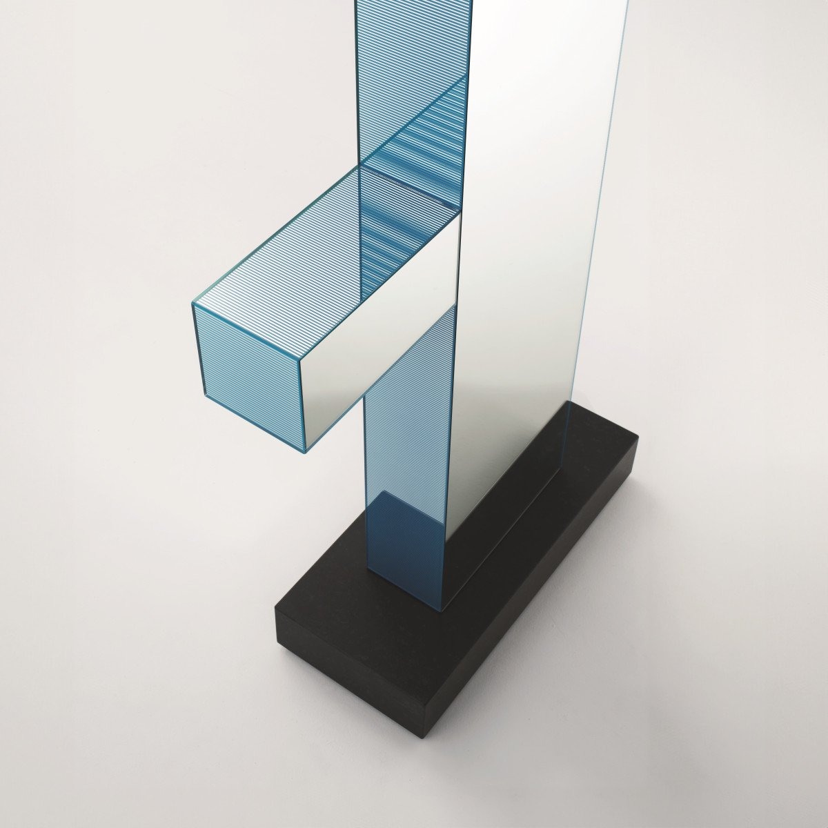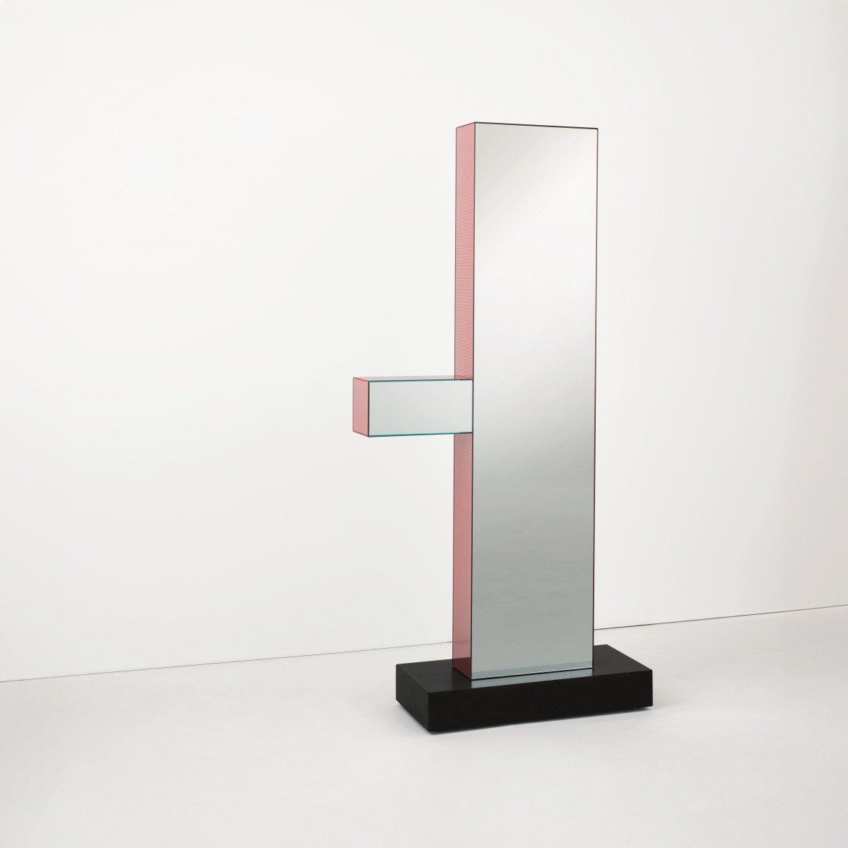 Зеркало-тотем с полкой для хранения предметов. Две передние стороны выполнены из белого зеркала, а боковые — из зеркала, украшенного тонкой цветной гравировкой (доступны в розовом и светло-голубом цветах). Основание выполнено из матового полированного абсолютно черного гранита.