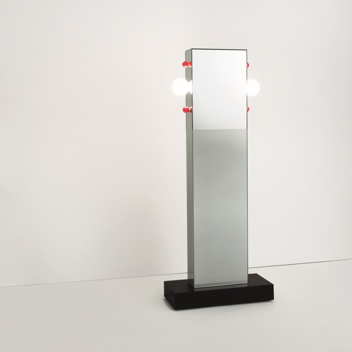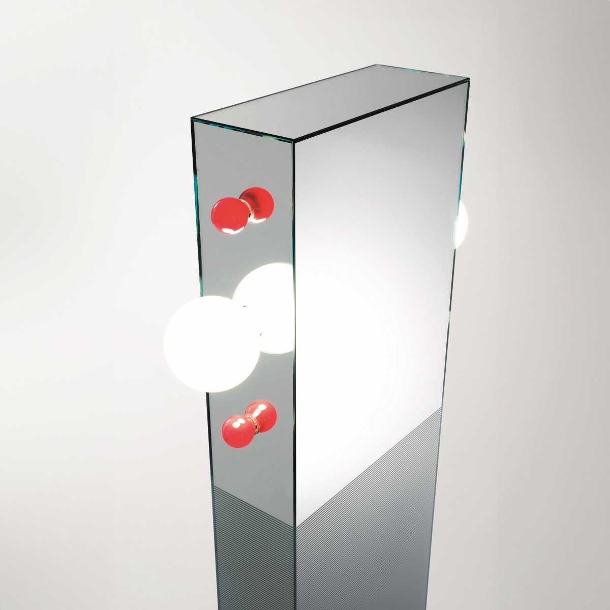Тотемное зеркало с красными и белыми лампочками. Боковые и фронтальная стороны зеркала частично украшены тонкой белой гравировкой по всему периметру. Основание выполнено из матового полированного абсолютно черного гранита.