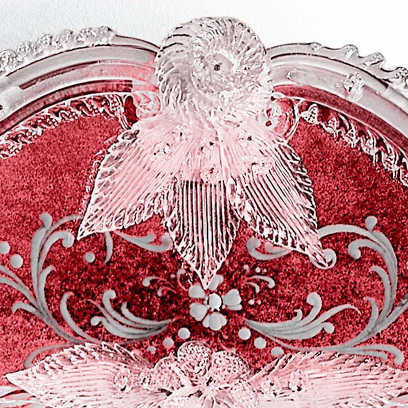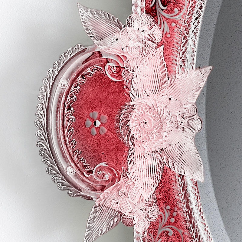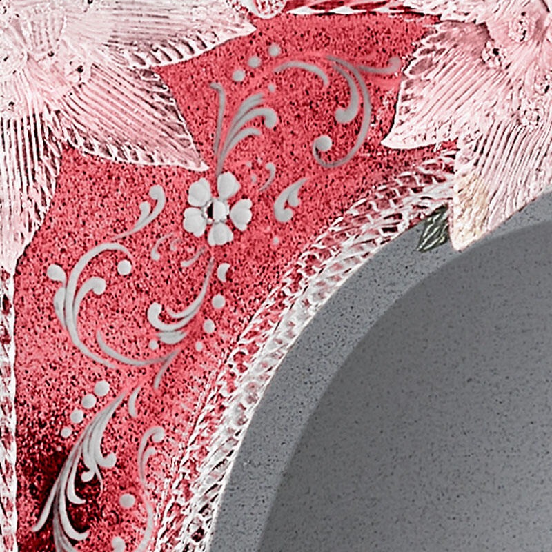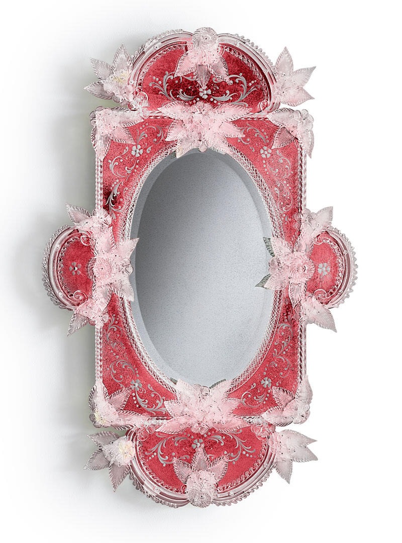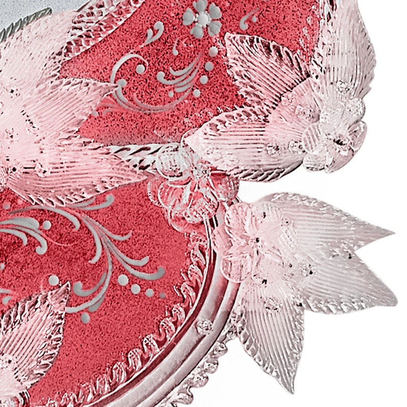 Конструкция из елового дерева с античной черной отделкой. Венецианское стекло с гравировкой, покрытое клубнично-красным лаком, и зеркальное покрытие под старину.
