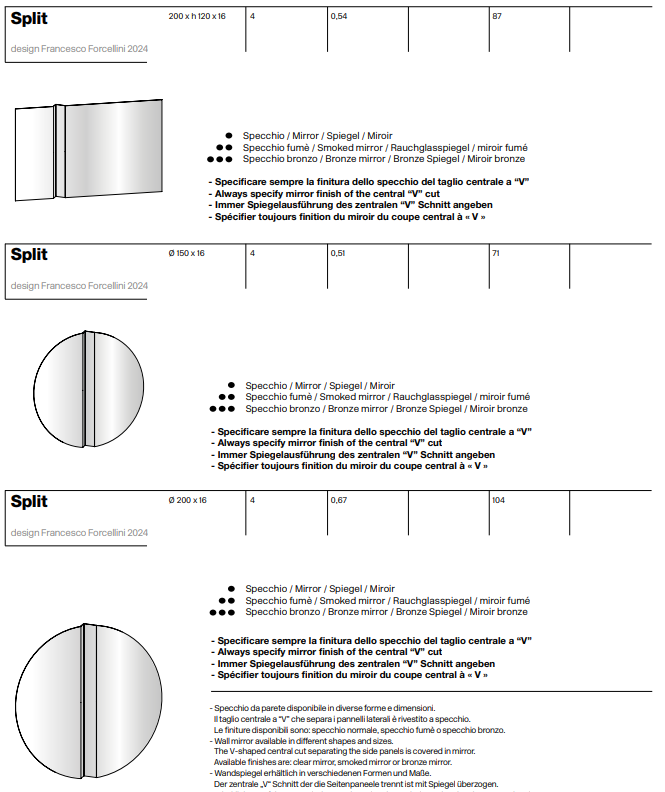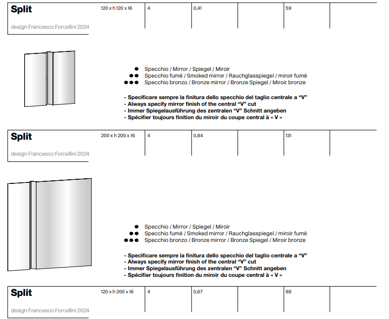 Сплит-это семейство зеркал, характеризующихся вертикальным разрезом. Внутри этого разреза две наклонные зеркальные поверхности отражают окружающее пространство и отражаются друг от друга, создавая динамическую игру отражений, которые умножаются, порождая новые перспективы.