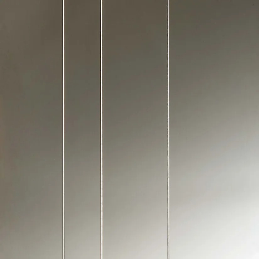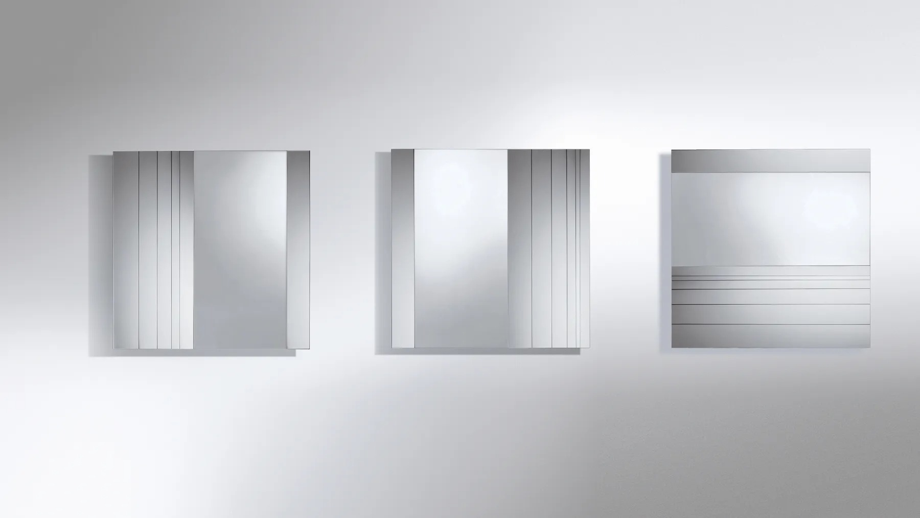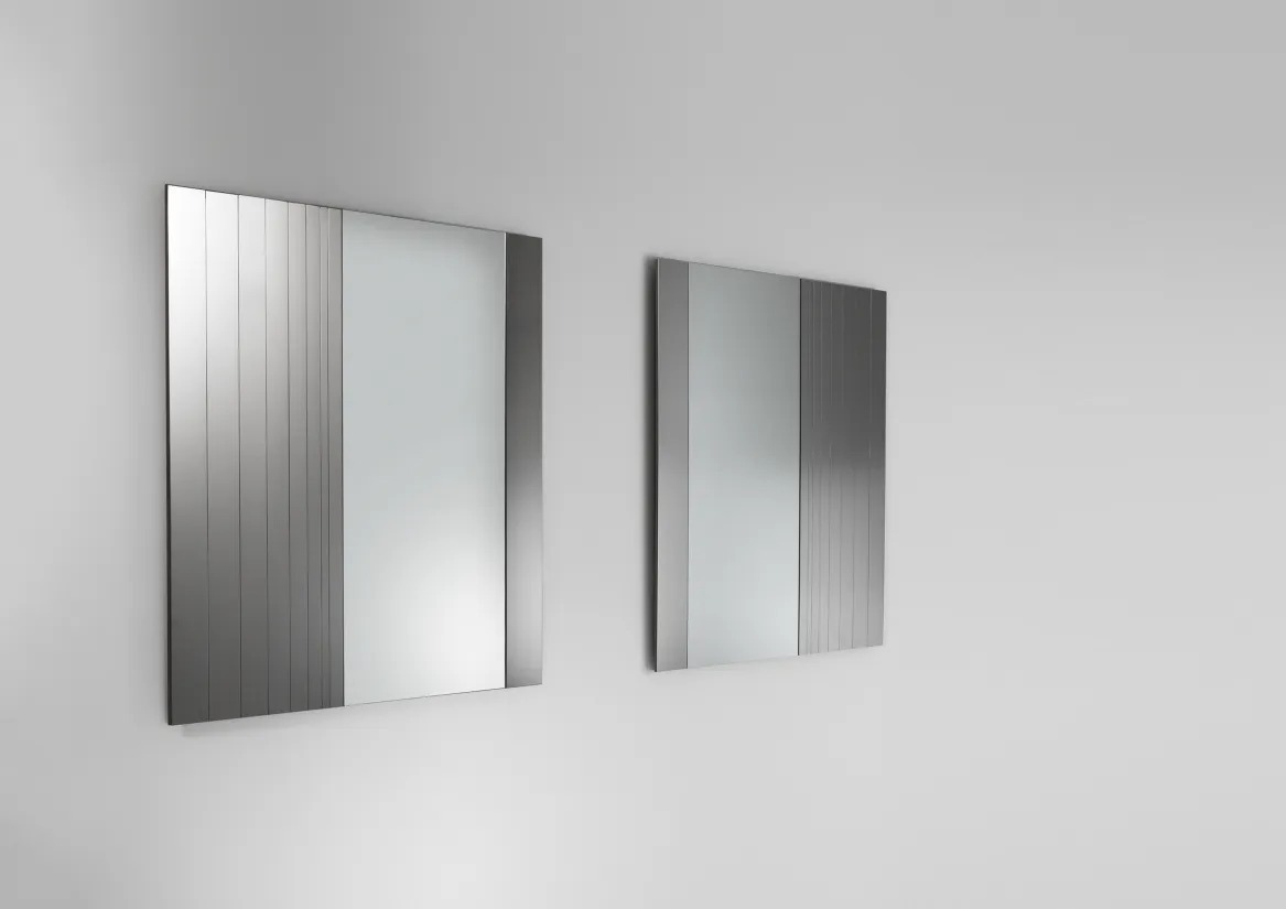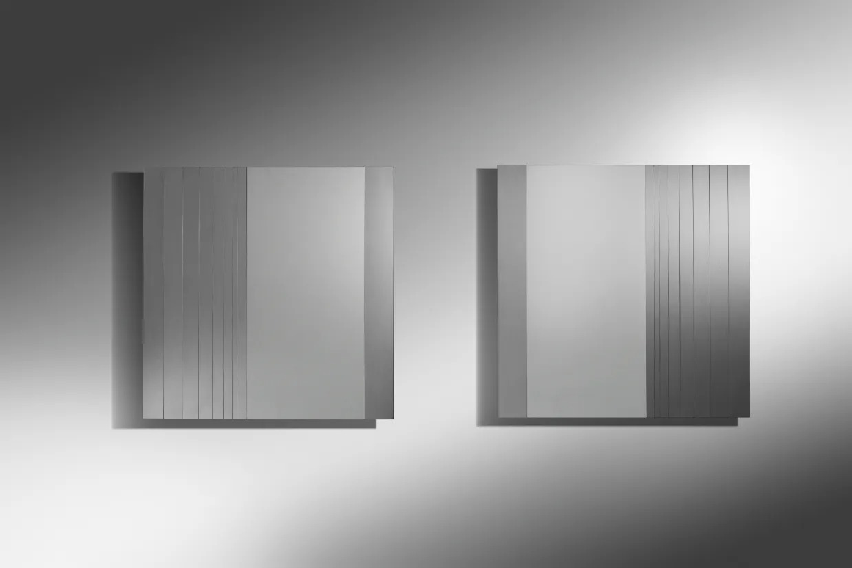 Прямоугольное или квадратное зеркало с серебряной отделкой и рамой, облицованной последовательностью металлических полосок.
