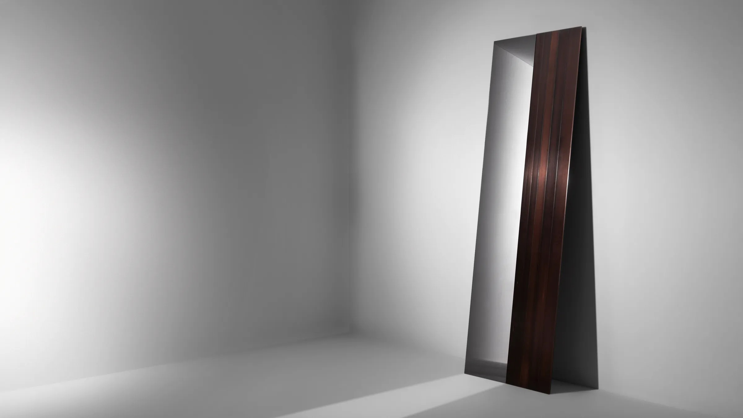 Прямоугольное или квадратное зеркало с серебряной отделкой и рамой, облицованной последовательностью металлических полосок.