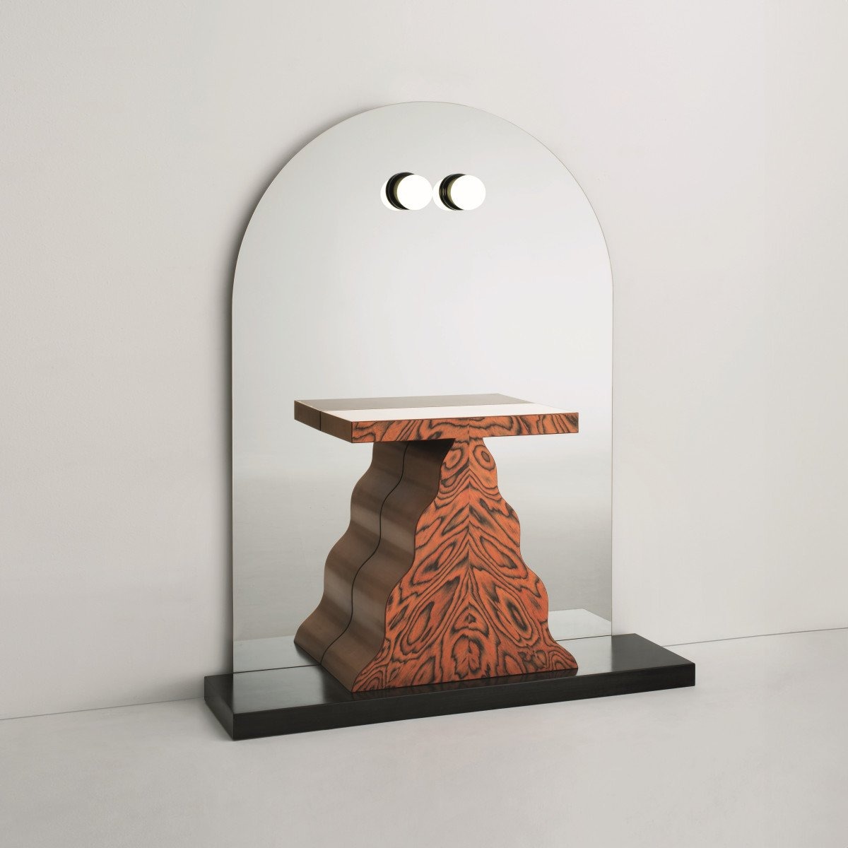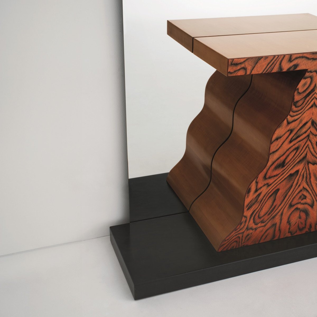 Зеркальный блок с хрустальным зеркалом, двумя полками и консольным столиком из грушевого дерева и шпона Alpi. Основание выполнено из дерева, покрытого анилиновым лаком. Каждое изделие имеет прогрессивную нумерацию.
