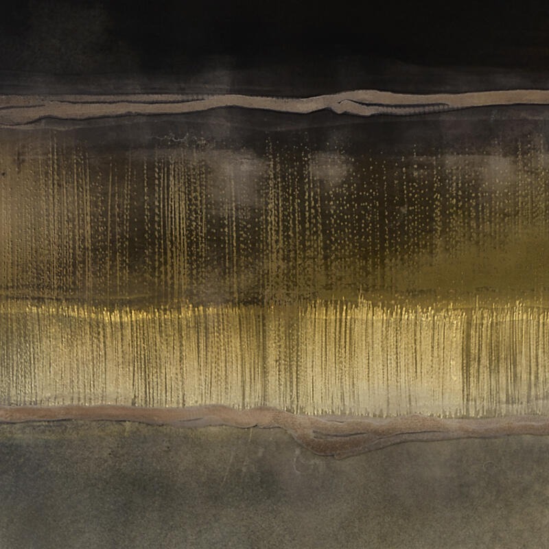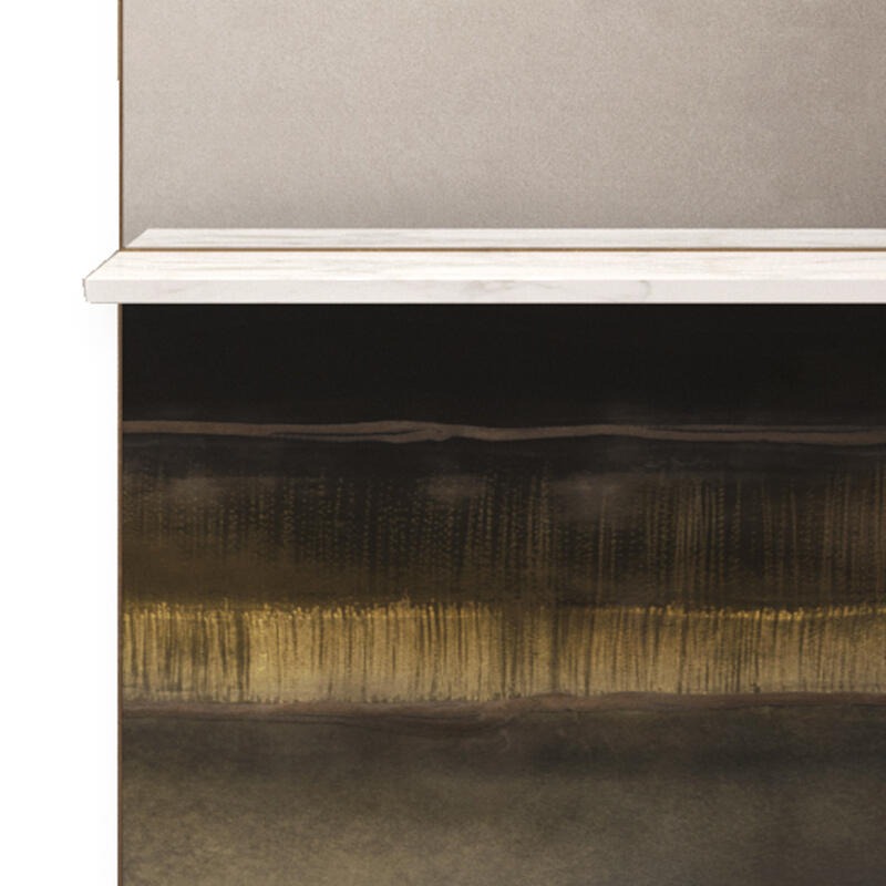 Зеркало из особо прозрачного стекла с деревянной структурой в виде сот и металлической рамой из полированной латуни.