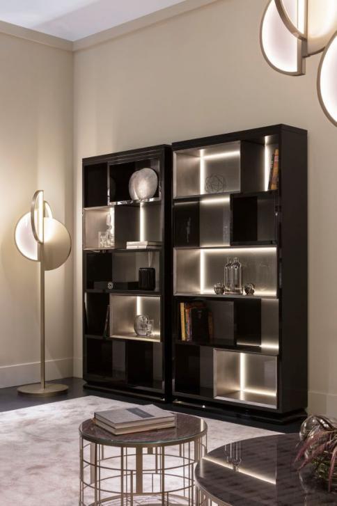 Книжный шкаф BLAKE от фабрики SICIS — это воплощение итальянской роскоши и уникального дизайна. Созданный из высококачественных материалов, он сочетает в себе элегантные геометрические формы и современные технологии. Шкаф выполнен из фанеры с эбеновым шпоном и черным деревом, а внутреннее пространство дополнено светодиодной подсветкой, что делает его не только функциональным, но и эстетически привлекательным.