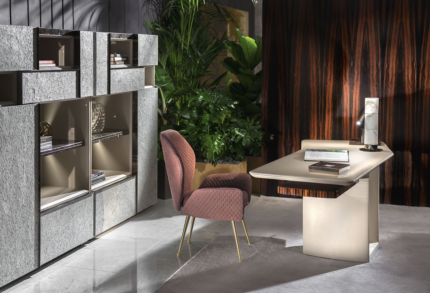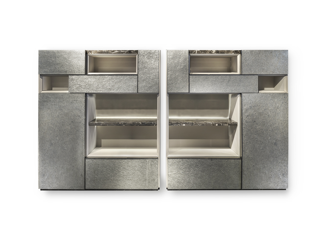 Двери и ящики шкафа Morfeo облицованы кварцитовым камнем, придающим ему прочность и благородство. Внутренние поверхности, выполненные из мягкой кожи, контрастируют с холодной твердостью камня, создавая атмосферу уюта и роскоши. Использование металлического профиля в качестве ручек для дверей и ящиков сочетает в себе функциональность и эстетику, подчеркивая мастерство дизайнеров, работавших над этой моделью.