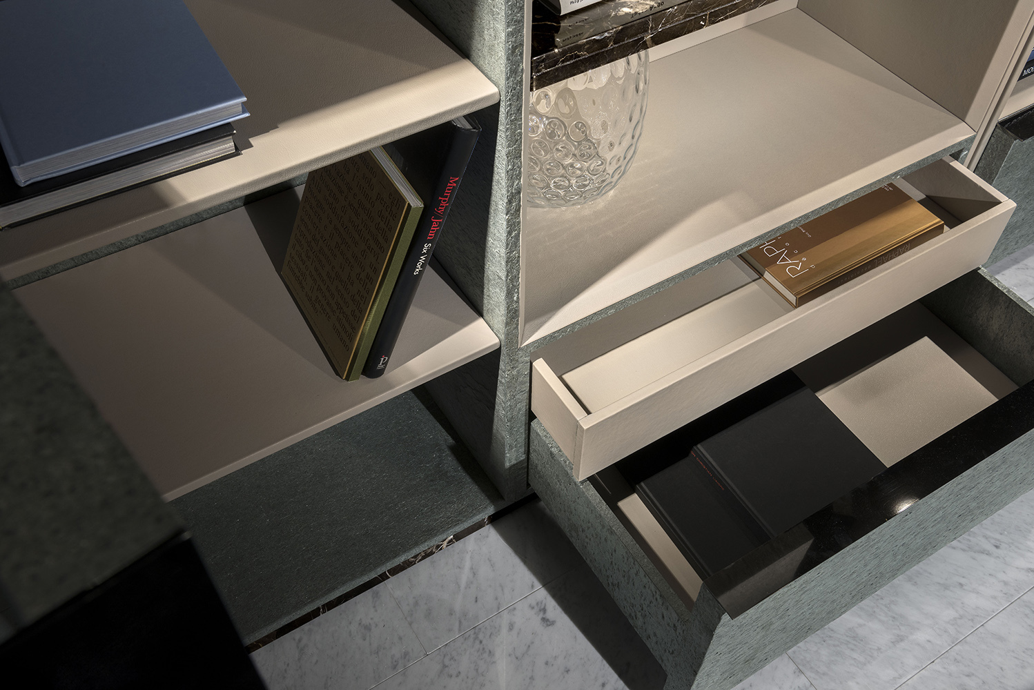 Книжный шкаф Morfeo от итальянской фабрики HESSENTIA — это идеальное сочетание минималистичного дизайна и высококачественных материалов. Шкаф отличается гармоничными пропорциями и уникальным исполнением: двери и ящики облицованы кварцитовым камнем, а внутренние поверхности оформлены мягкой кожей, создавая уютный контраст с твердостью камня.