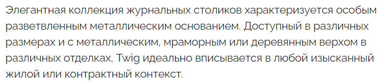 Кофейный столик TWIG Giulio Marelli — это больше, чем предмет мебели. Это символ изысканного вкуса, воплощение итальянского мастерства и внимания к деталям. Приобретая его, вы инвестируете в вечную элегантность и безупречный стиль. Доверьтесь традициям итальянского производства и сделайте свой дом по-настоящему роскошным.