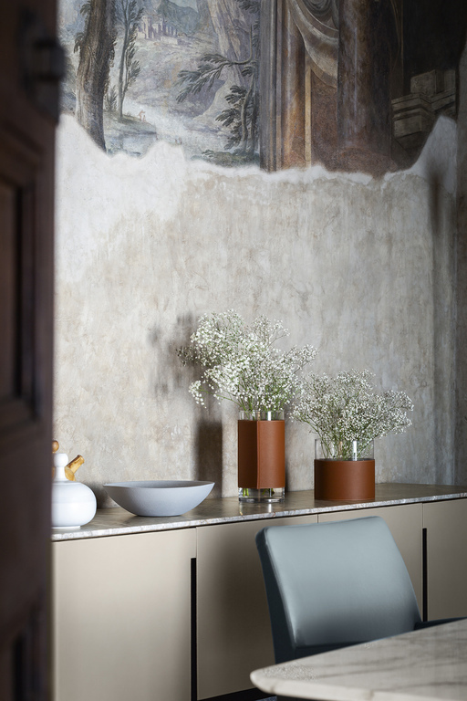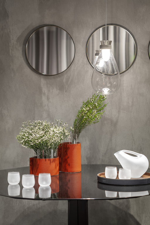 Каждая ваза отличается ручной отделкой: края изысканно тонированы и обработаны вручную в тональных цветах, что свидетельствует о высочайшем уровне мастерства итальянских дизайнеров. Использование качественного стекла и кожи гарантирует долговечность и устойчивость к времени, что делает эти вазы не только стильными, но и практичными. Эта коллекция — результат творческого подхода, основанного на итальянских традициях.