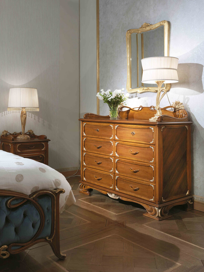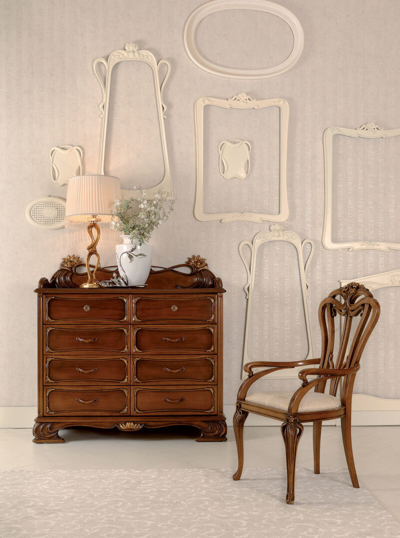 Комод 2051CC станет изысканным дополнением спальни, гостиной или гардеробной. Его вместительные ящики идеально подходят для хранения белья, аксессуаров или ценных вещей, а благородный дизайн придает интерьеру завершенность. Представьте, как мягкий свет люстры играет на полированной поверхности, создавая атмосферу уюта и роскоши — именно так выглядит настоящий итальянский стиль.