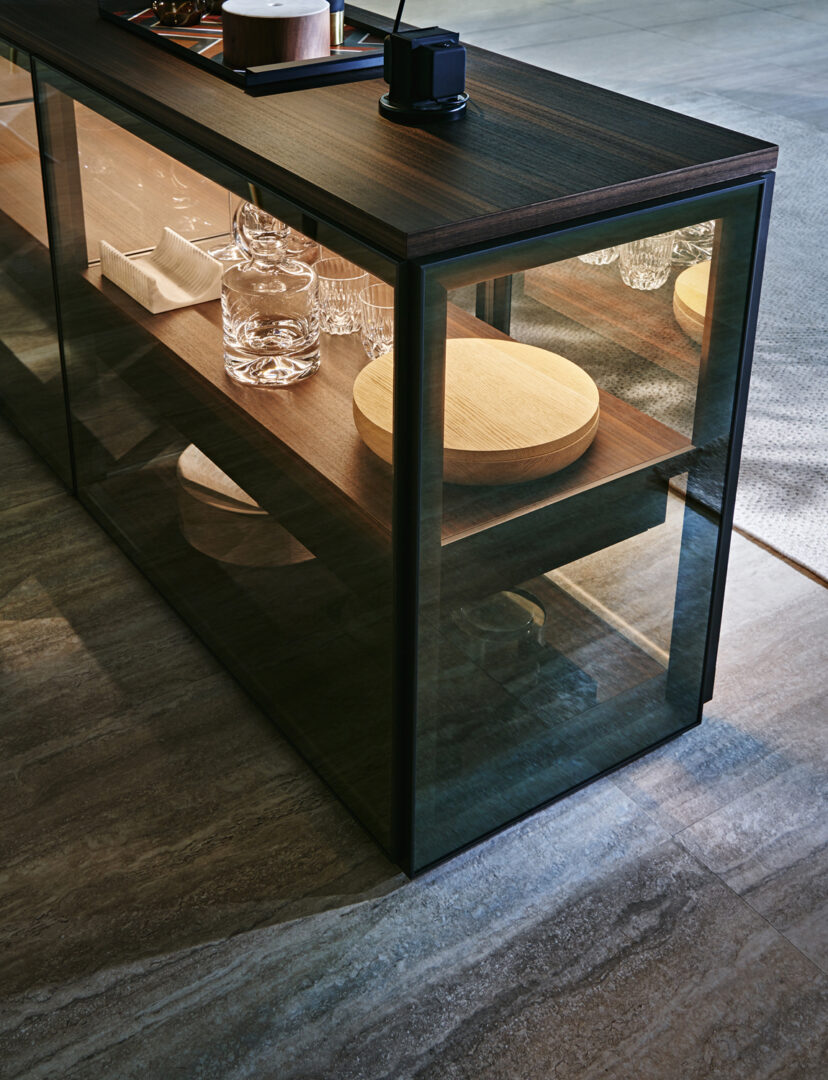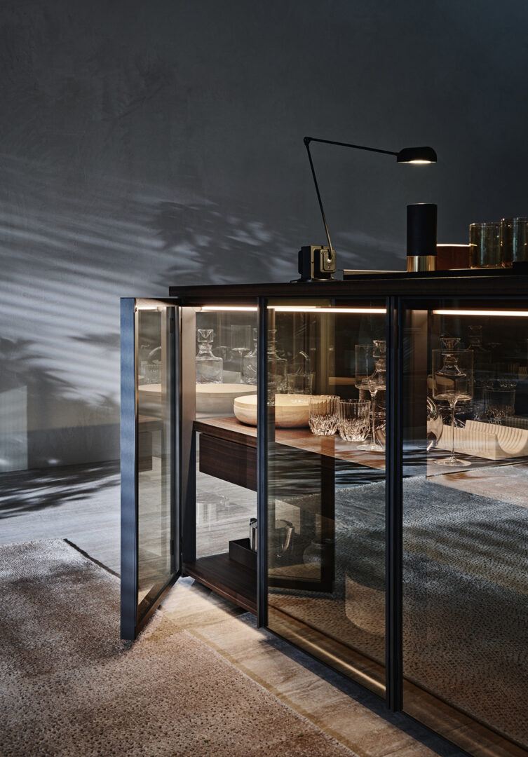 Комод ADRIEN от итальянской фабрики MOLTENI & CO — авангардное решение для хранения, сочетающее чистоту линий и инновационные технологии. Минималистичный дизайн с ультратонким алюминиевым каркасом подчеркивает прозрачность стекла Stopsol, создавая эффект легкости. Встроенная светодиодная подсветка полок добавляет предметам выразительности.