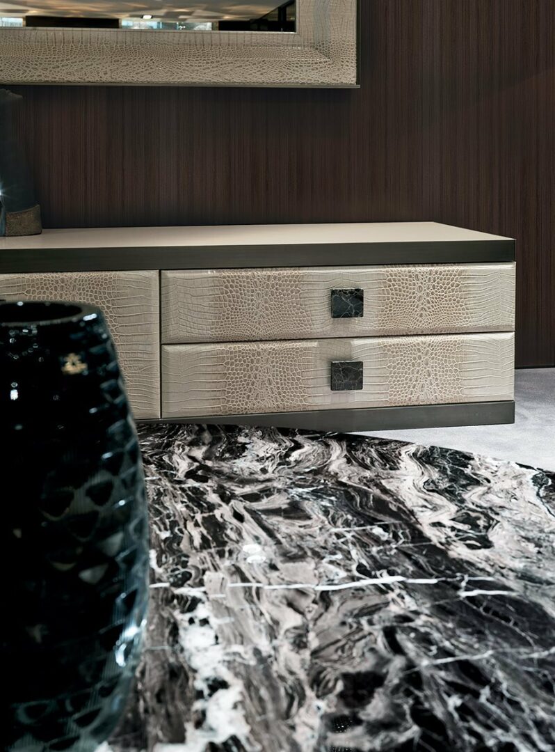 Комод ASPEN изготавливается из высококачественных материалов, таких как глянцевый лак, эбеновое и ореховое дерево, а также разнообразные сорта мрамора, включая Sahara Noir и Calacatta. Эти благородные материалы не только делают изделие визуально привлекательным, но и обеспечивают долговечность, что является важным аспектом при выборе предметов мебели премиум-класса.