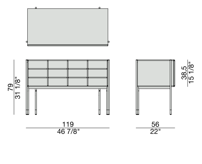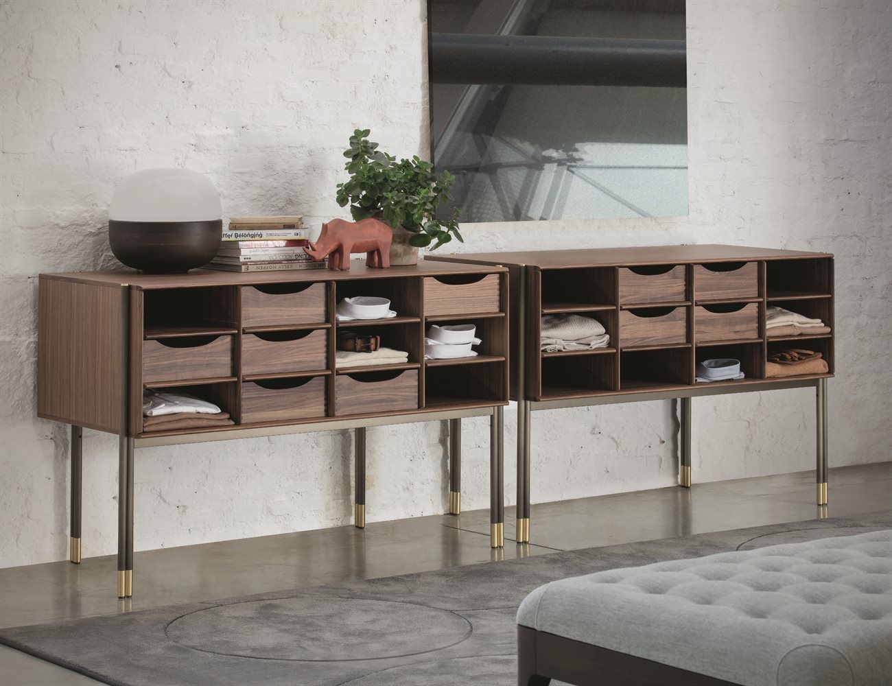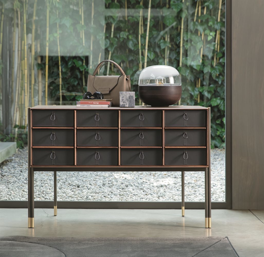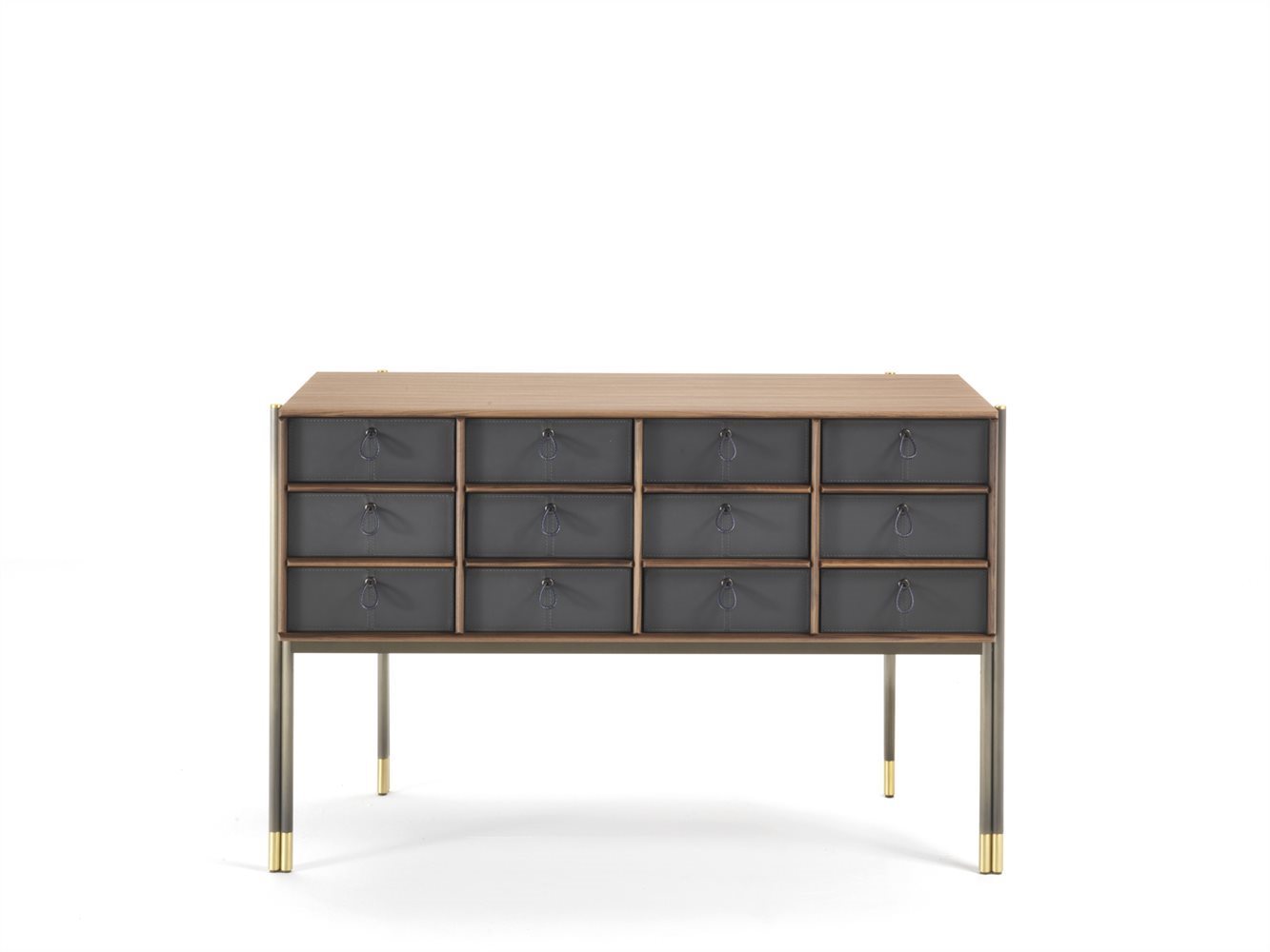 Изготовленный из орехового дерева каналетта, этот комод предлагает двенадцать отделений, что предоставляет возможность вставить до двенадцати ящиков BAYUS. Верхние профили и разделители отделений выполнены из массива ореха, обеспечивая прочность и стиль. Основание и наконечники из матовой бронзовой латуни придают изделию элегантный вид.