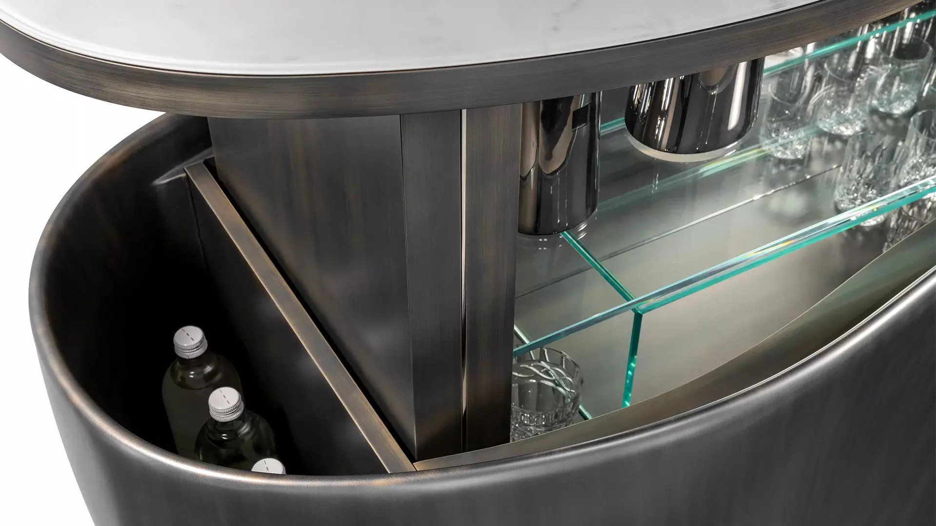 Комод COCO DE MER от итальянской фабрики REFLEXANGELO – воплощение роскоши и функциональности. Доступен в матовом лакированном исполнении или с отделкой из латуни и титанового атласного металла. Мраморная стеклянная столешница придает модели элегантность, а электрический подъемный механизм с дистанционным управлением обеспечивает удобство использования. Внутренний контейнер оснащен зеркальными полками и держателями для бутылок, что делает комод идеальным для хранения коллекционных напитков.