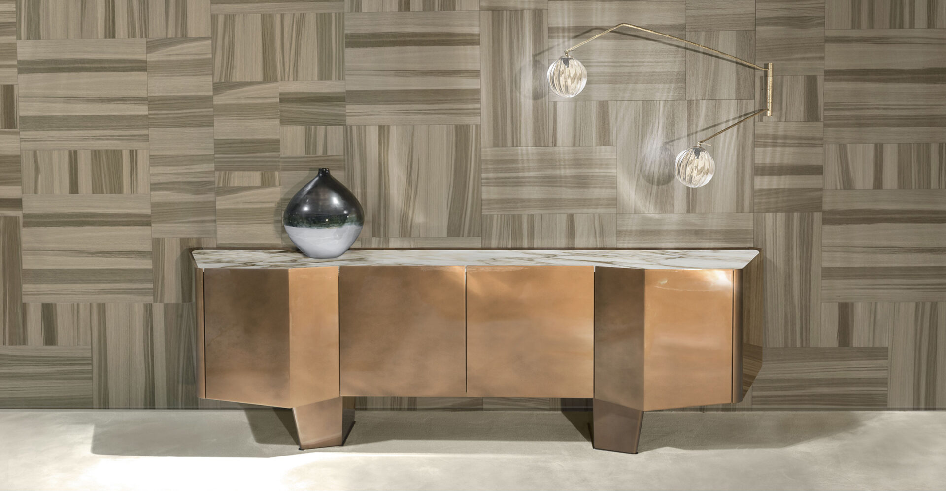 Форма комода напоминает грани драгоценного камня, а двойное основание с формой «L» придает ему стабильность и изящество. Гранёные дверцы и бронзовая отделка создают эффект отражений, наполняя пространство светом.