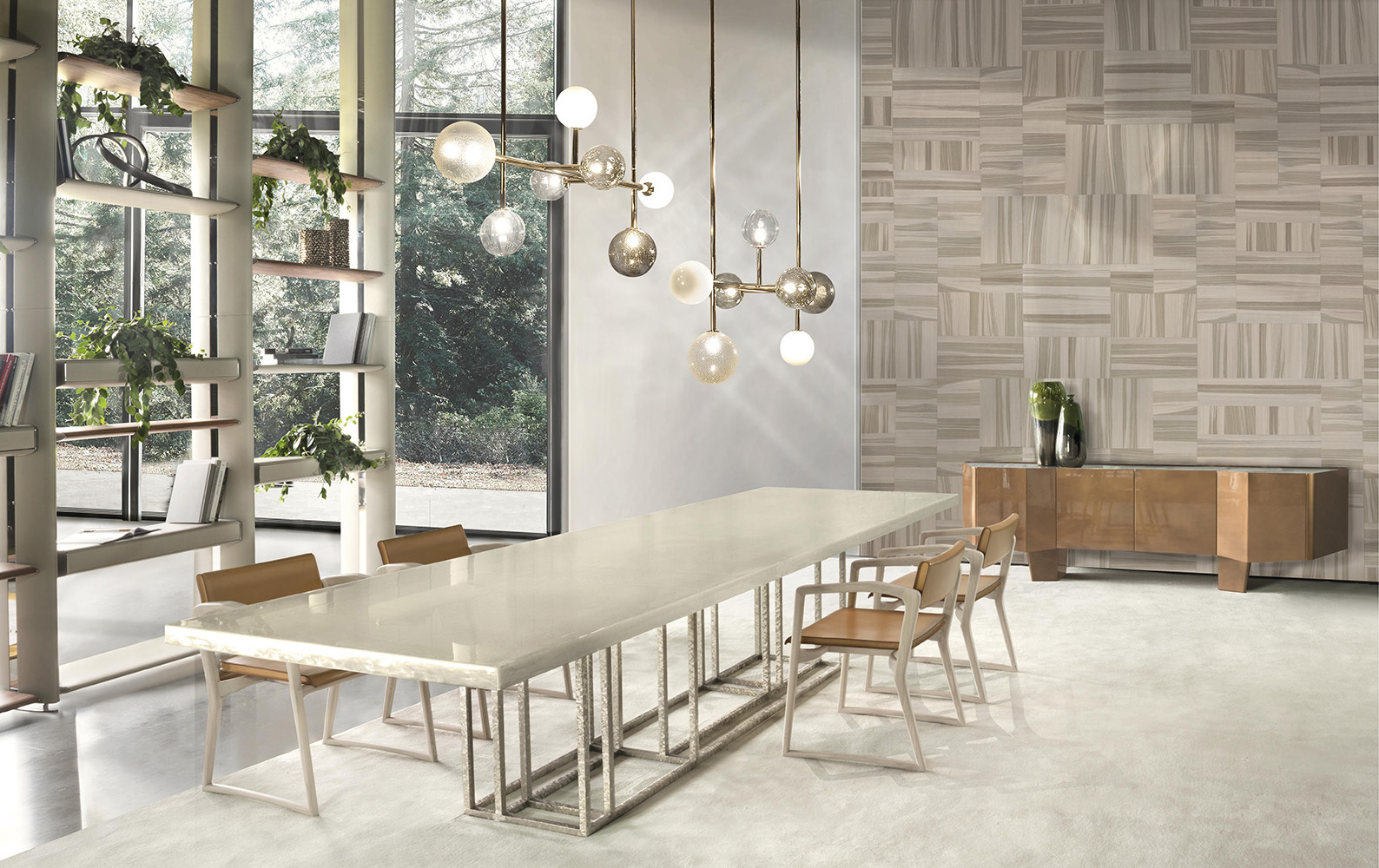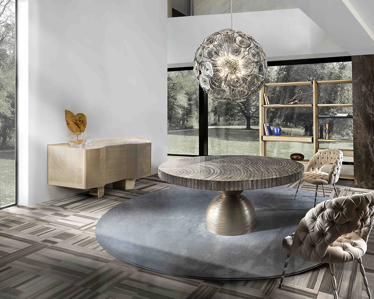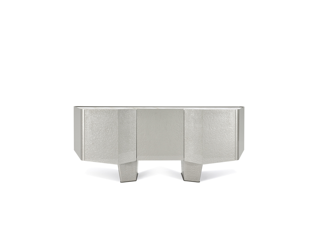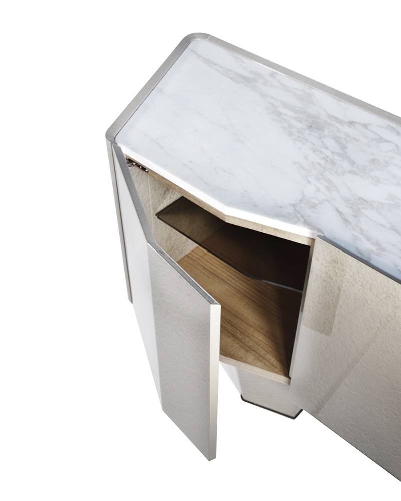 Форма комода напоминает грани драгоценного камня, он словно создан для того, чтобы привлекать взгляды и создавать атмосферу уюта. Двойное основание с формой «L» придаёт конструкции стабильность и изящество, а гранёные дверцы делают его центром внимания в любом интерьере. Выбор натуральных цветов для лакировки позволяет легко сочетать комод с различными мраморами, а уникальная бронзовая металлическая отделка создаёт эффект играющих отражений, наполняя пространство светом и теплом.