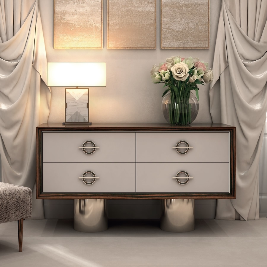 Комод DYLAN — это не просто мебель, это произведение искусства, созданное вручную с особым вниманием к деталям. Его изящные линии и гармоничные пропорции делают его идеальным дополнением как для классических, так и для современных интерьеров. Вы сможете выбрать отделку из натурального дерева или лаковое покрытие в цветовой гамме RAL, а также металлизированные вставки с отделкой под латунь, матовый никель или хром. Каждый элемент комода тщательно продуман и выполнен с любовью к традициям итальянского дизайна.