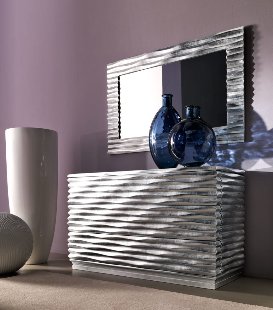 Комод EBON 1 от итальянской фабрики CORTEZARI – элегантное решение для современного интерьера. Изготовлен из натурального дерева с резным волновым узором, дополнен утопленной стеклянной столешницей. 3 просторных ящика с системой открывания push-pull обеспечивают удобное хранение.