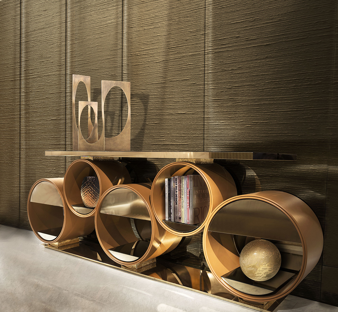 Комод выполнен из цилиндрических элементов, обитых мягкой кожей и дополненных гравированными металлическими деталями. Столешница из бронзового зеркала создает визуальный эффект глубины, а функциональные ящики в верхней части повышают практичность.