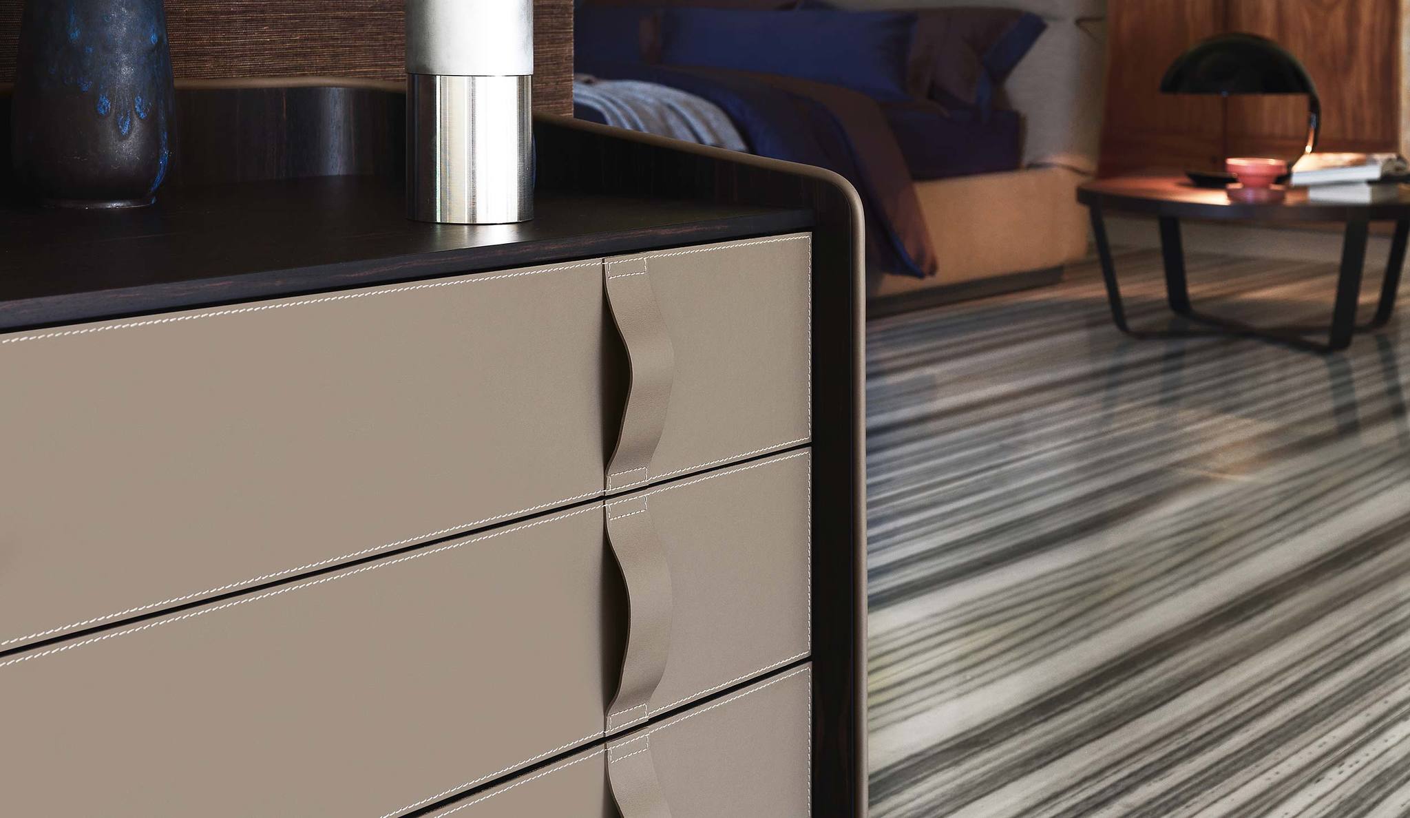 Комод Gentleman привлекает внимание своим уникальным дизайном, который сочетает в себе классические и современные элементы. Фасады ящиков обиты мягкой кожей с изысканными видимыми швами, что придает ему характерный стиль и статусность. Каждая деталь комода говорит о высоком уровне мастерства дизайнеров и их уважении к традициям итальянского производства.