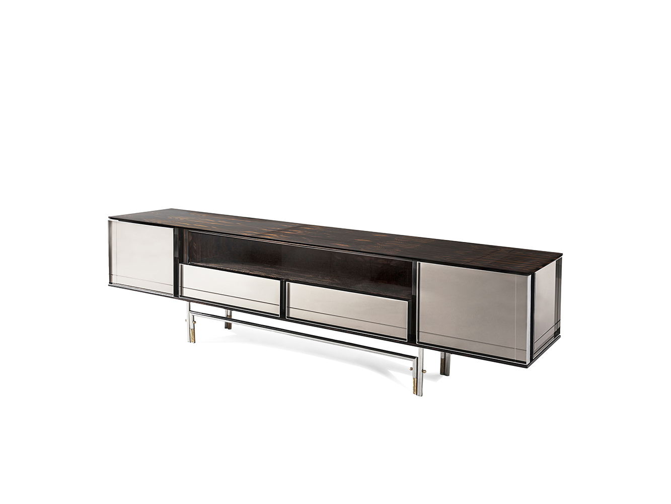 Комод изготовлен из ценной древесины Ziricote, известной своим богатым текстурным рисунком и долговечностью. Этот благородный материал не только впечатляет своей эстетикой, но и гарантирует долговечность, что является важным аспектом для предметов мебели премиум-класса. Зеркала и металлические элементы, использованные в конструкции, добавляют комоду современный взгляд, создавая ощущение легкости и элегантности.