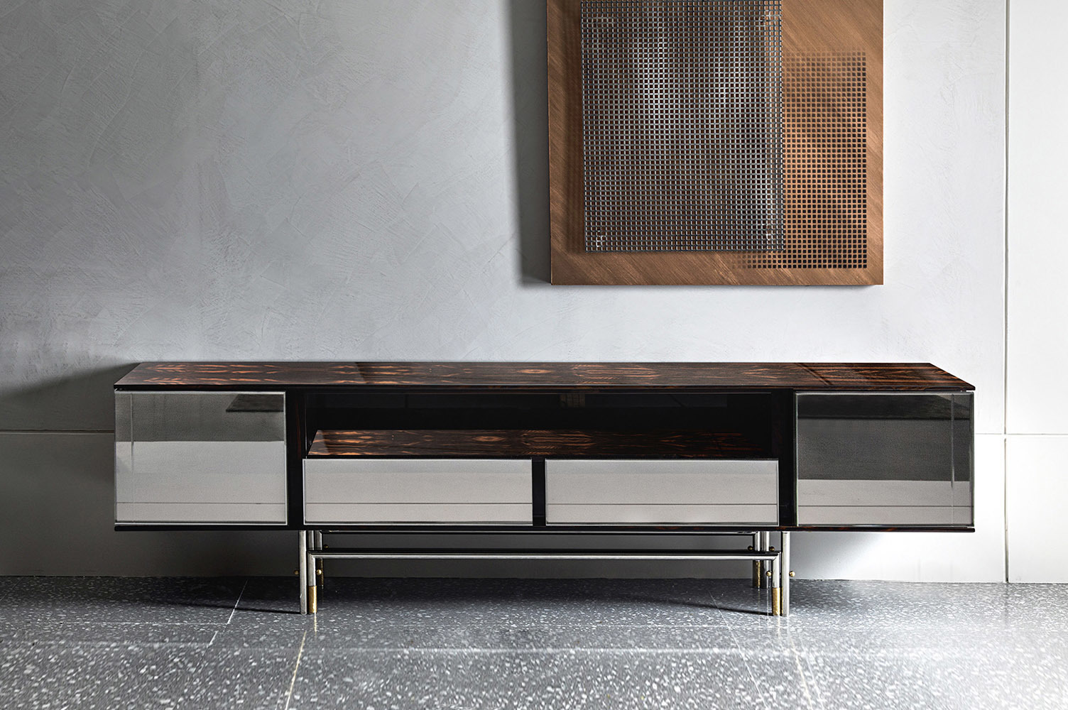 Комод Harbour — это воплощение итальянской мебельной традиции, изысканный предмет, который добавит элегантности вашему пространству. Изготовленный из ценной древесины Ziricote, он сочетает в себе классические элементы и современный дизайн, подчеркивая внимание к деталям. Гладкие металлические вставки и бронзовые зеркала с геометрическим узором делают его настоящим произведением искусства.