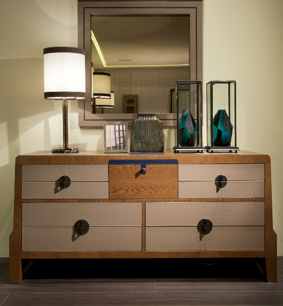 Комод HE123 от итальянской фабрики MEDEA – воплощение элегантности и функциональности. Изготовлен из натурального дерева с роскошными вставками из кожи, ручки покрыты бронзовым лаком для изысканного акцента.