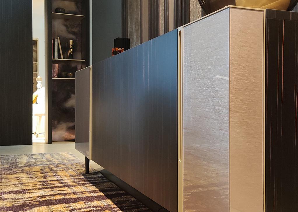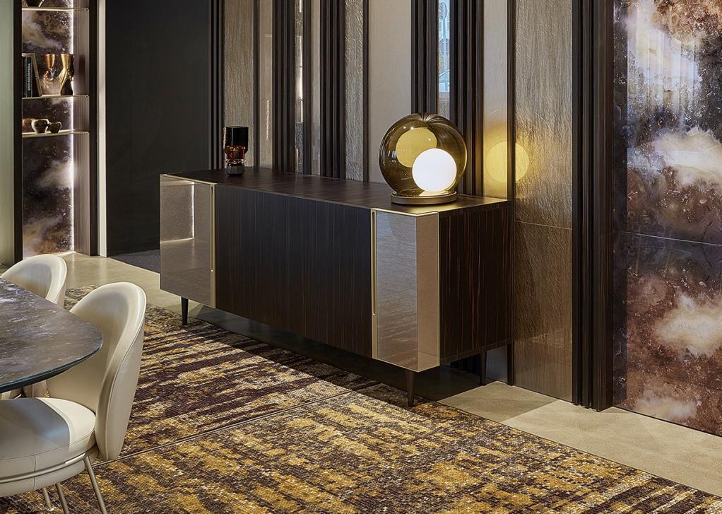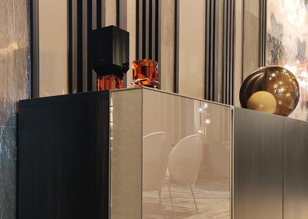 Комод изготовлен из матового черного дерева, что придает ему благородный вид, а также из стеклянных панелей Vetrite, отличающихся высокой прочностью и легкостью. Утопленные тянущие детали выполнены из атласного шампанского, придавая изделию роскошный вид. Внутренние полки обиты ковриками из микрофибры, а светодиодное освещение с датчиком открытия обеспечивает удобство использования, создавая эффектный свет при открытии дверей.