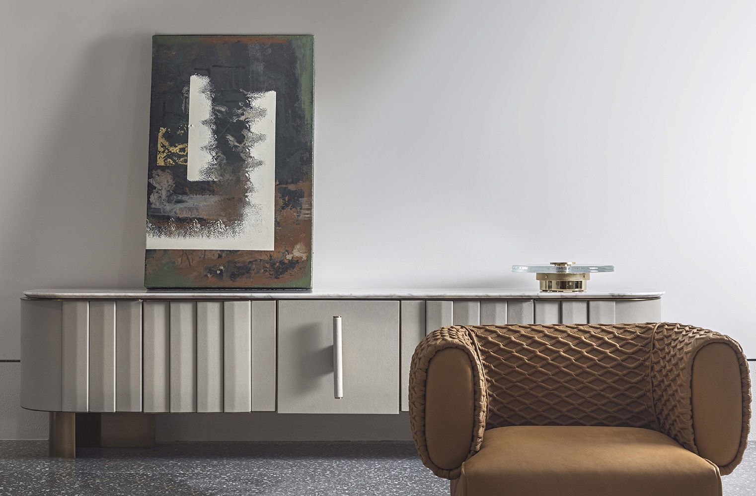 Комод Morgan привлекает внимание благодаря своим трехмерным дверям, украшенным вертикальными элементами, обитыми кожей с эффектом «плиссе». Элегантная ручка центральной створки в виде цилиндрического элемента подчеркивает современный стиль, в то время как боковые створки открываются с помощью металлической пластины, изящно выступающей из верхнего профиля. Этот подход к дизайну сочетает в себе эстетические и функциональные качества, что делает комод идеальным выбором для любой гостиной.