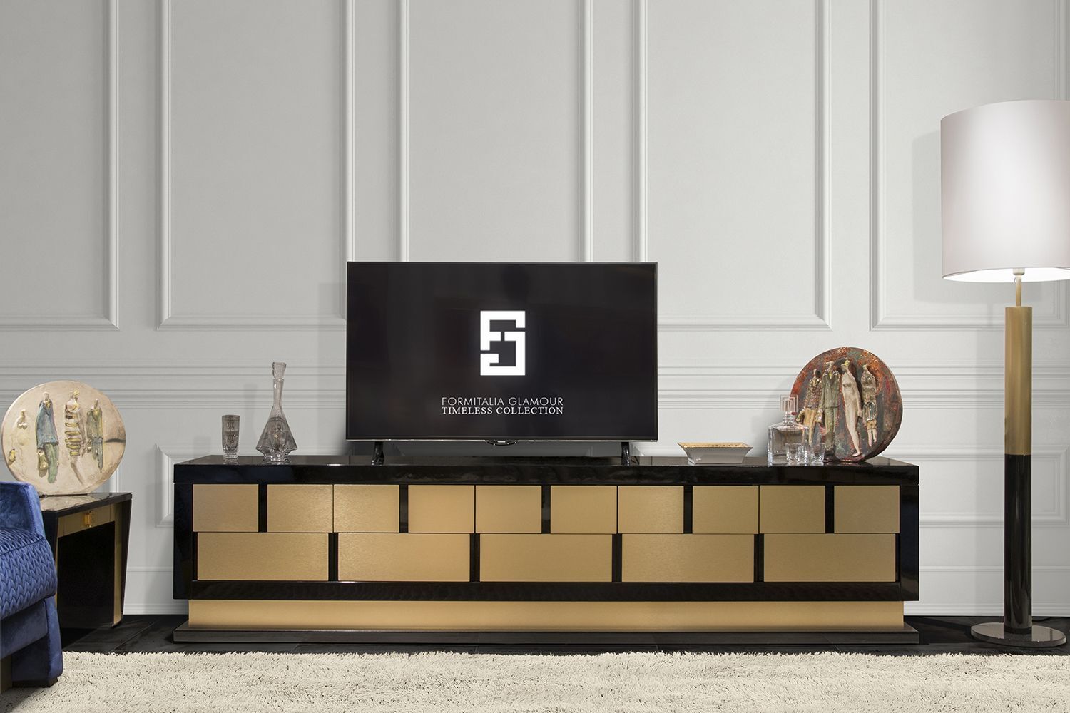 Комод MUZIO от итальянской фабрики FORMITALIA – воплощение роскоши и функциональности. Корпус покрыт черным глянцевым лаком, фронтальные ящики выполнены из металлического золотого сатина, а основание украшено латунной отделкой. Размеры: 250×47×60 см.
