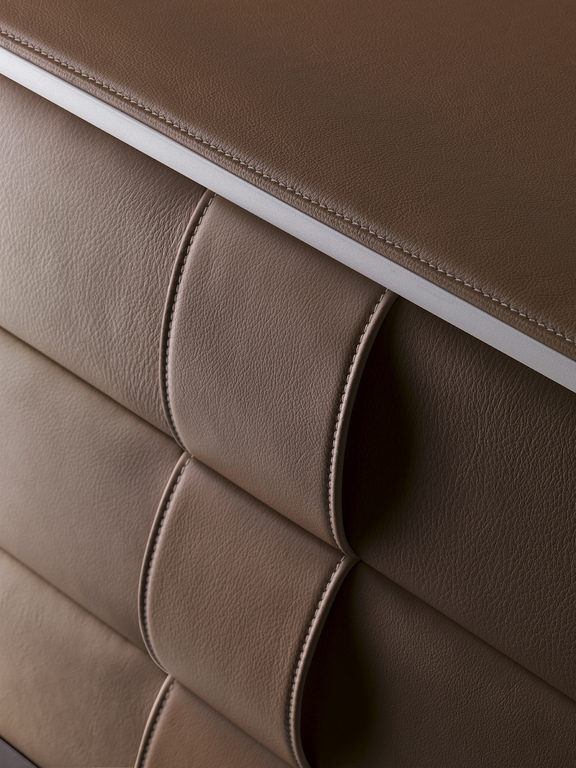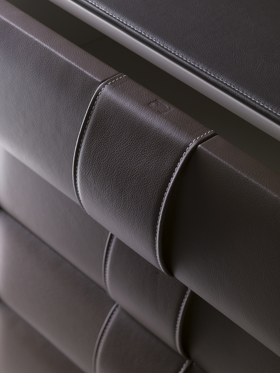Комод оснащен выдвижными ящиками на металлических полозьях с механизмом плавного закрывания, что обеспечивает комфорт и долговечность. Передняя часть и ручки обиты кожей Pelle Frau®, добавляя изделию изысканности.
