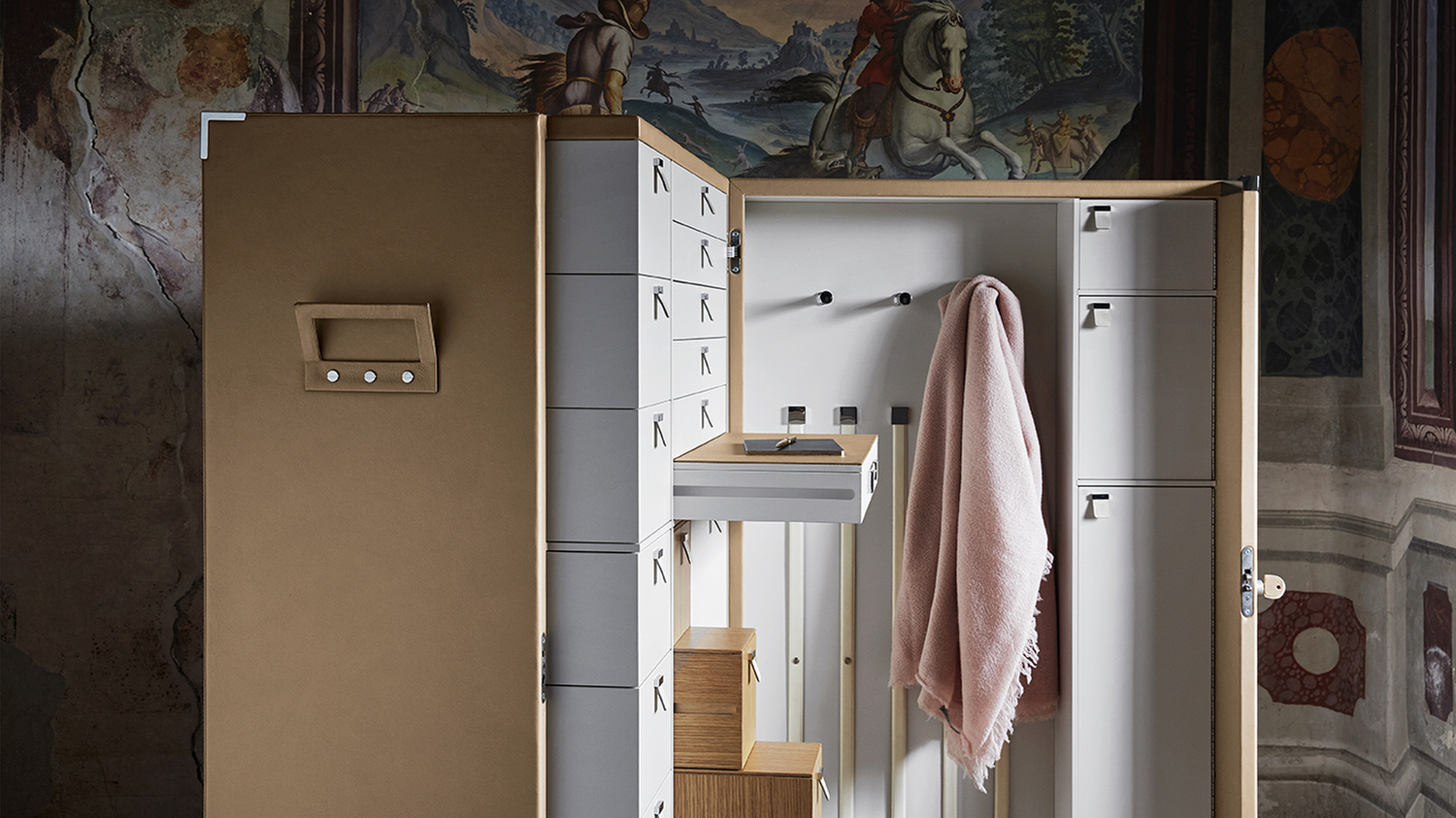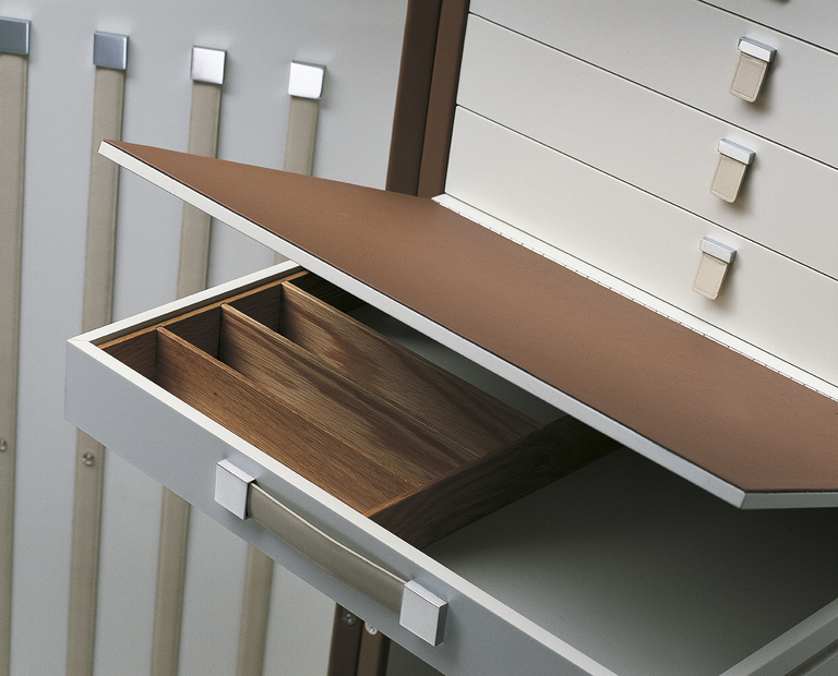 Внутреннее пространство комода Oceano также удивляет: здесь вы найдете мини-складной письменный стол с мягким пуфом, который можно легко убрать при необходимости. Кожаная обивка Pelle Frau® добавляет роскоши и теплоты, а фурнитура из хромированного металла и седельной кожи завершает образ, подчеркивая внимание к деталям.