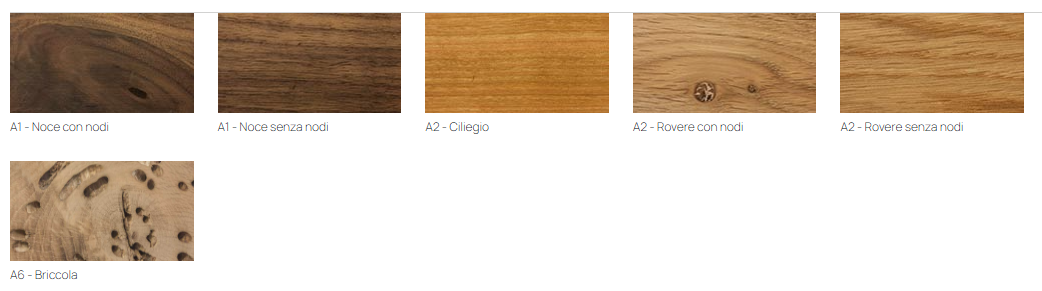 Доступен в различных вариантах отделки: грецкий орех (с сучками и без), дуб, бриккола, а также с металлическими элементами в цветах RAL и эффектами состаренной бронзы, титана и стали. Габариты: 120×50×80 см.