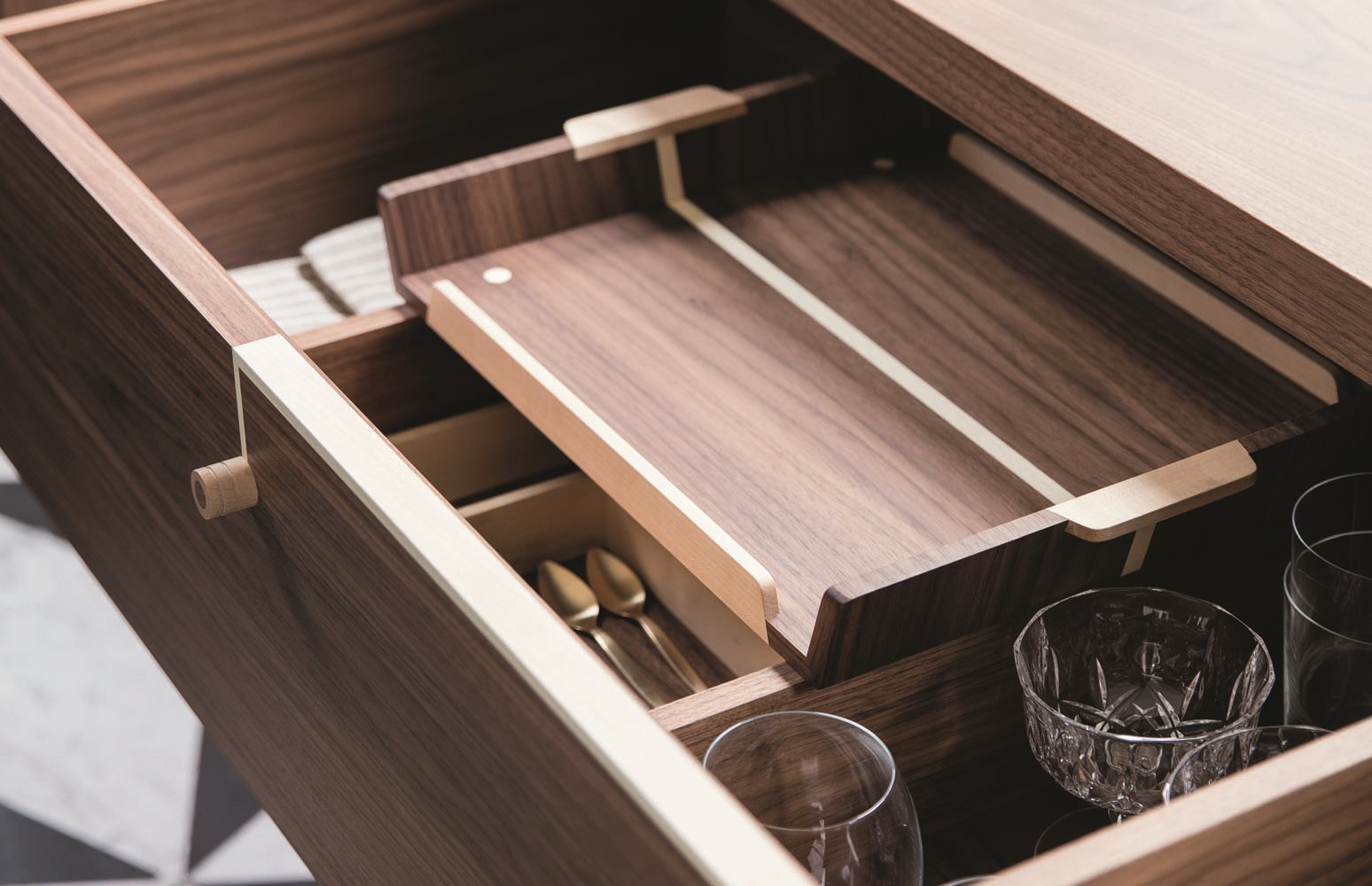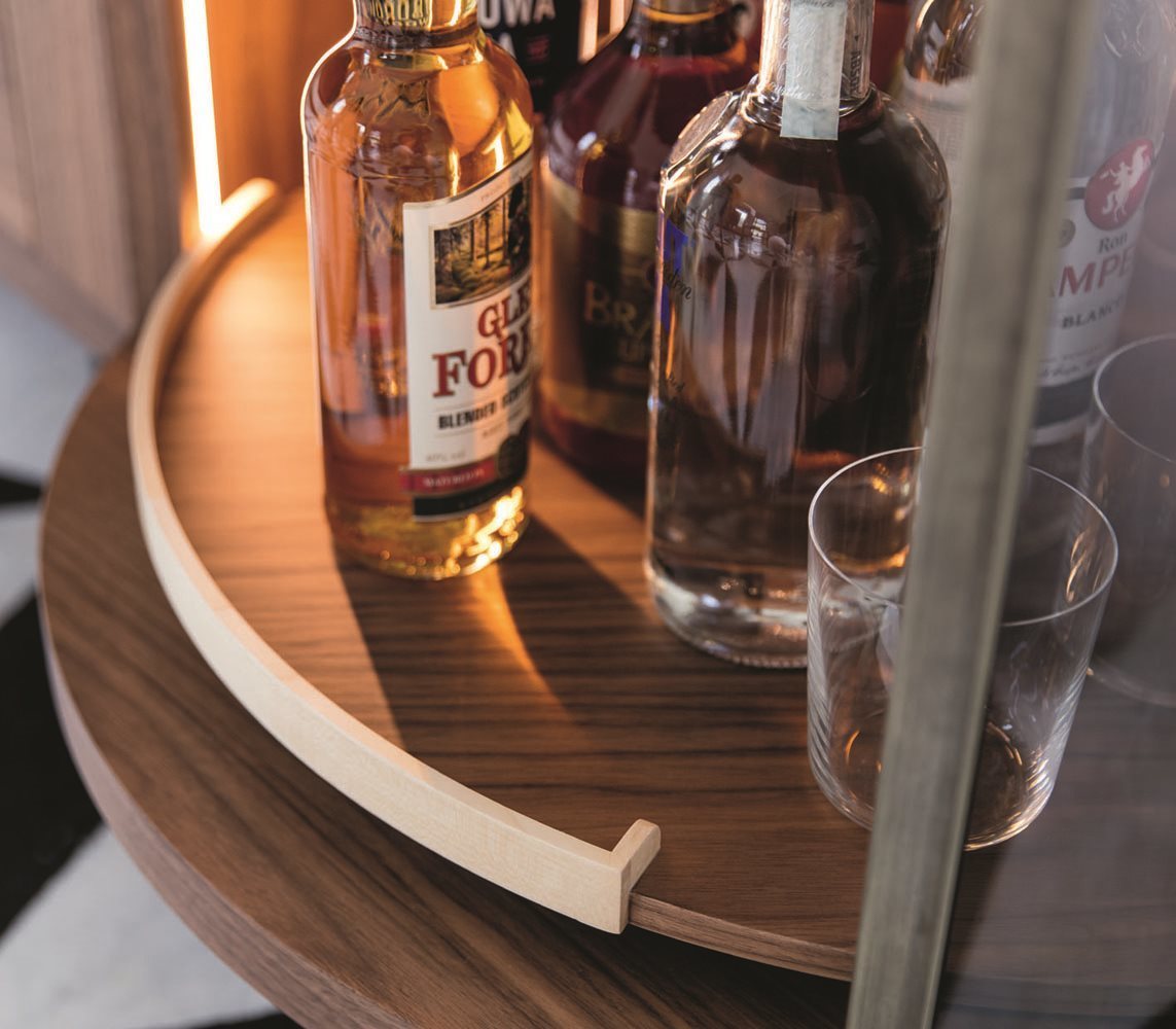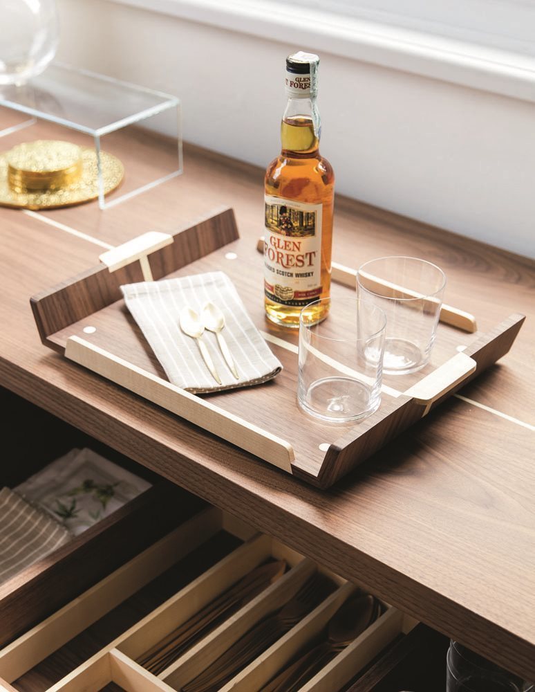 В производстве комода используются только высококачественные материалы, что гарантирует долговечность и надежность. Орех каналетта и клен не только эстетически привлекательны, но и обладают высокой прочностью. Изогнутая дверца из дымчатого стекла, которая открывает доступ к барному модулю, добавляет нотку современности и уникальности. Внутреннее пространство комода продумано до мелочей: ящики оснащены подстаканником и разделителем для столовых приборов, что делает его не только красивым, но и функциональным.