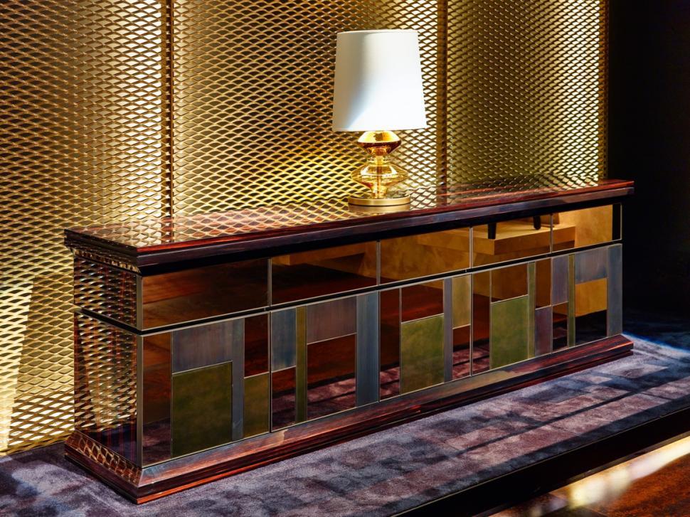 Комод выполнен из черного дерева Macassar с элементами полированной латуни и стильными ручками из античной бронзы. Каждая деталь, от ящиков до светодиодного освещения, создана с любовью и вниманием к качеству.