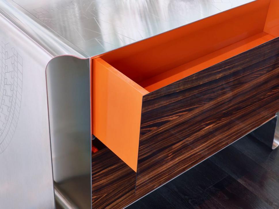 В производстве комода используются только благородные материалы, что гарантирует его долговечность и безупречный внешний вид. Рама из матовой нержавеющей стали и гравировка по бокам создают ощущение роскоши и прочности, а глянцевое покрытие из макассарского эбенового дерева добавляет нотку тепла и уюта. Размеры комода — 122x40x87 см — делают его идеальным для размещения в любых интерьерах, обеспечивая достаточное пространство для хранения ваших вещей.
