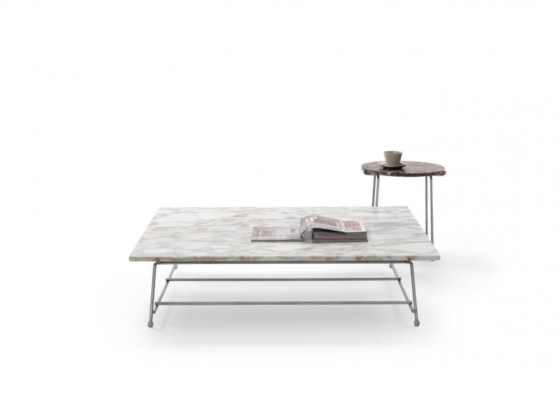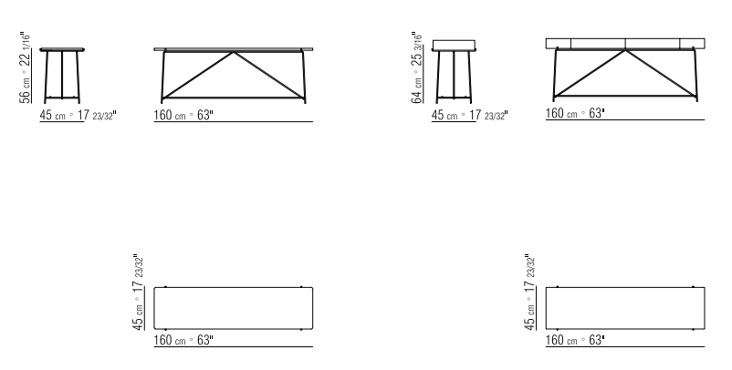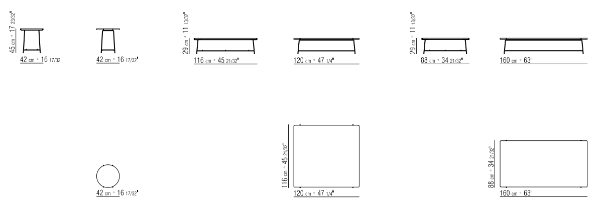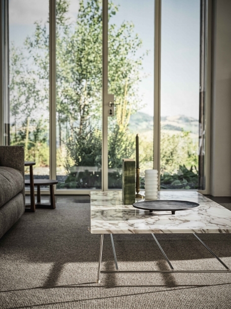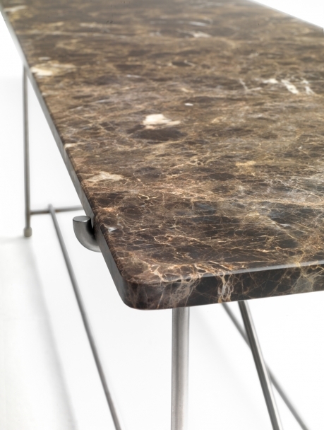 Верх выполнен из шпонированного ореха Canaletto с разнообразием оттенков (натуральный, кофе, венге, черное дерево) или благородного мрамора (Calacatta Oro, Carrara, Nero Marquina). Ножки оснащены термопластичными наконечниками для защиты пола.