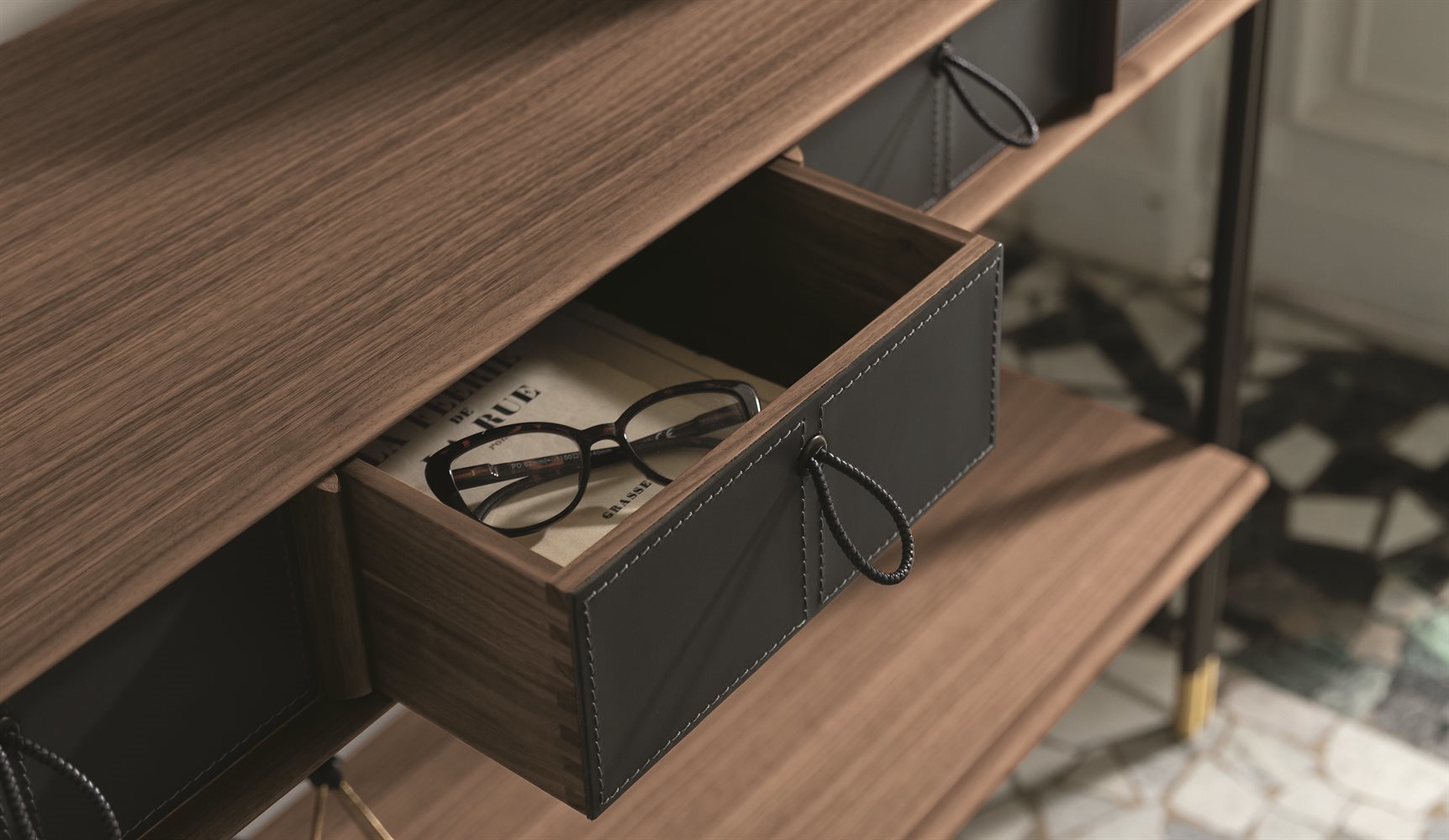 Эта эксклюзивная консоль выполнена из орехового дерева каналетта и оснащена четырьмя отделениями, что позволяет разместить до четырех ящиков Bayus 5-6-8. Верхние профили и разделители отделений также из массива ореха, что добавляет прочности и элегантности. Основание из металла Bronzoro и наконечники из матовой латуни придают изделию стильный и современный вид.
