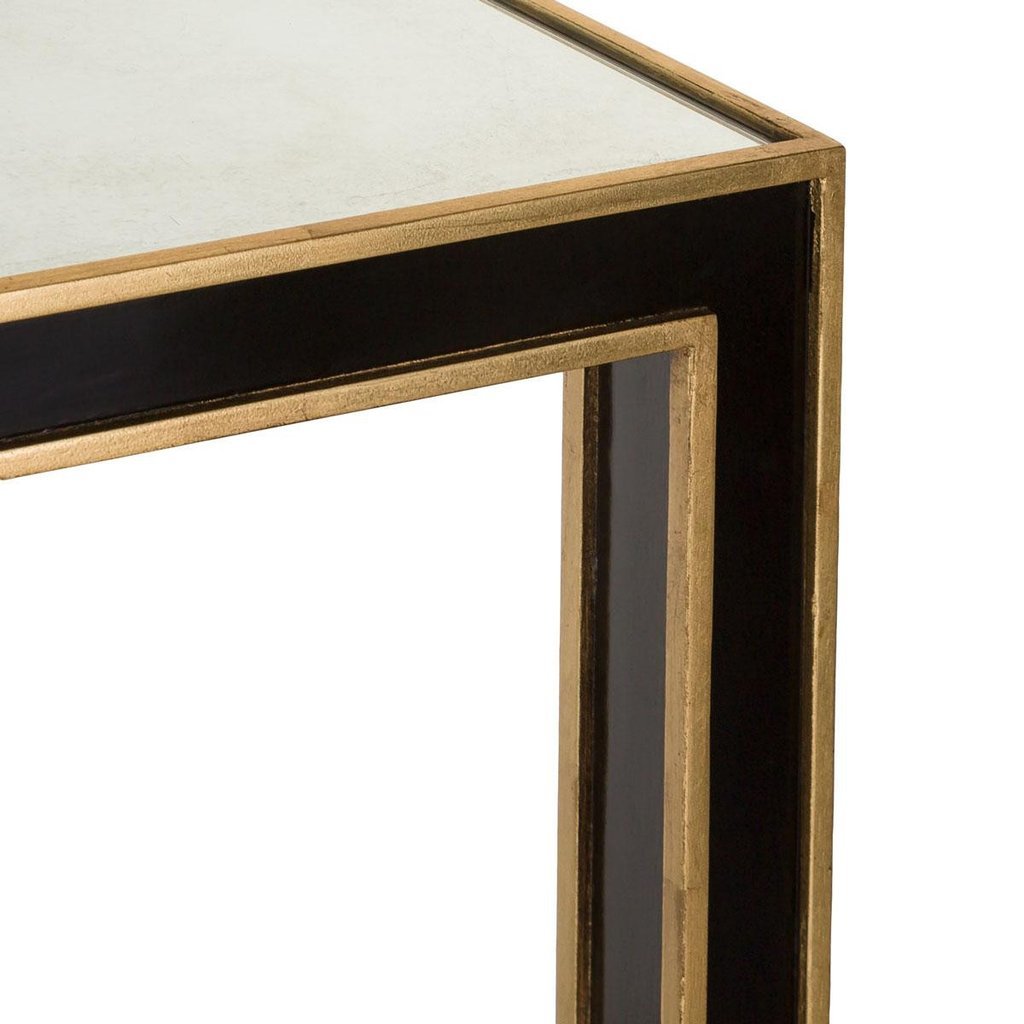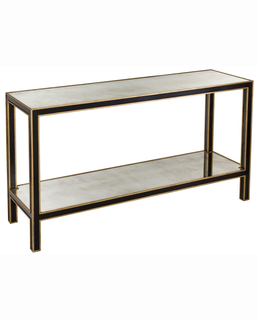 Консоль CAMBRIA от фабрики LOUVREHOME (Китай) — элегантное решение для современного интерьера. Вдохновленная мелодией Коула Портера, модель сочетает роскошную отделку из окрашенного черного дерева с золотой окантовкой и зеркальной столешницей. Четыре прямые ножки и полка из состаренного зеркала придают изделию легкость и стиль.