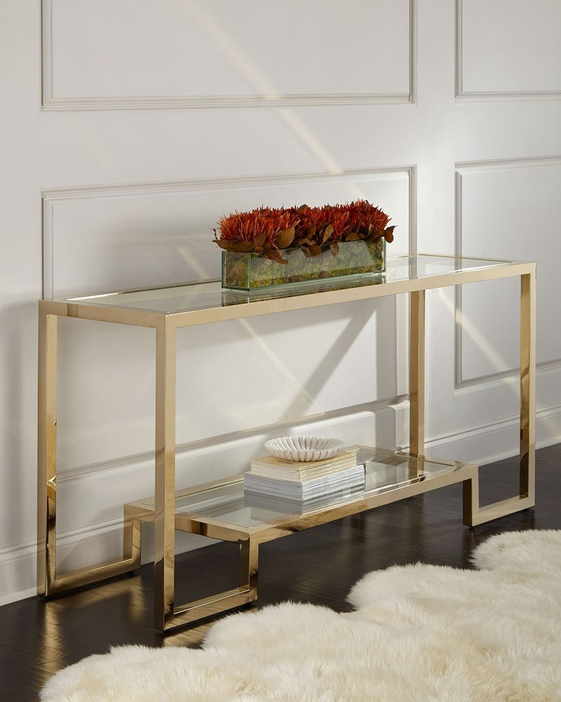 Консоль DEBORAH отличается элегантным минимализмом, где каждая деталь продумана до мелочей. Ее строгие геометрические формы и плавные изгибы создают ощущение легкости, несмотря на монументальность конструкции. Золотой оттенок каркаса придает изделию королевский шик, а закаленное стекло добавляет современный акцент. Этот предмет мебели идеально впишется в: