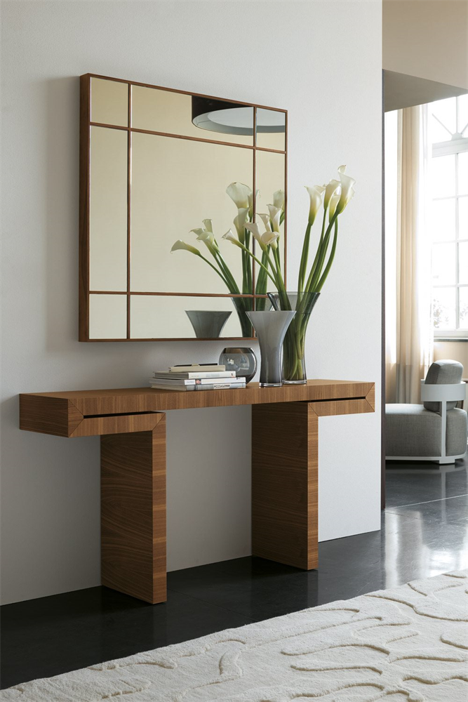 Изготовленная из дуба или ореха каналетта, консоль выделяется сплошной текстурой, которая гармонично повторяет линии конструкции.