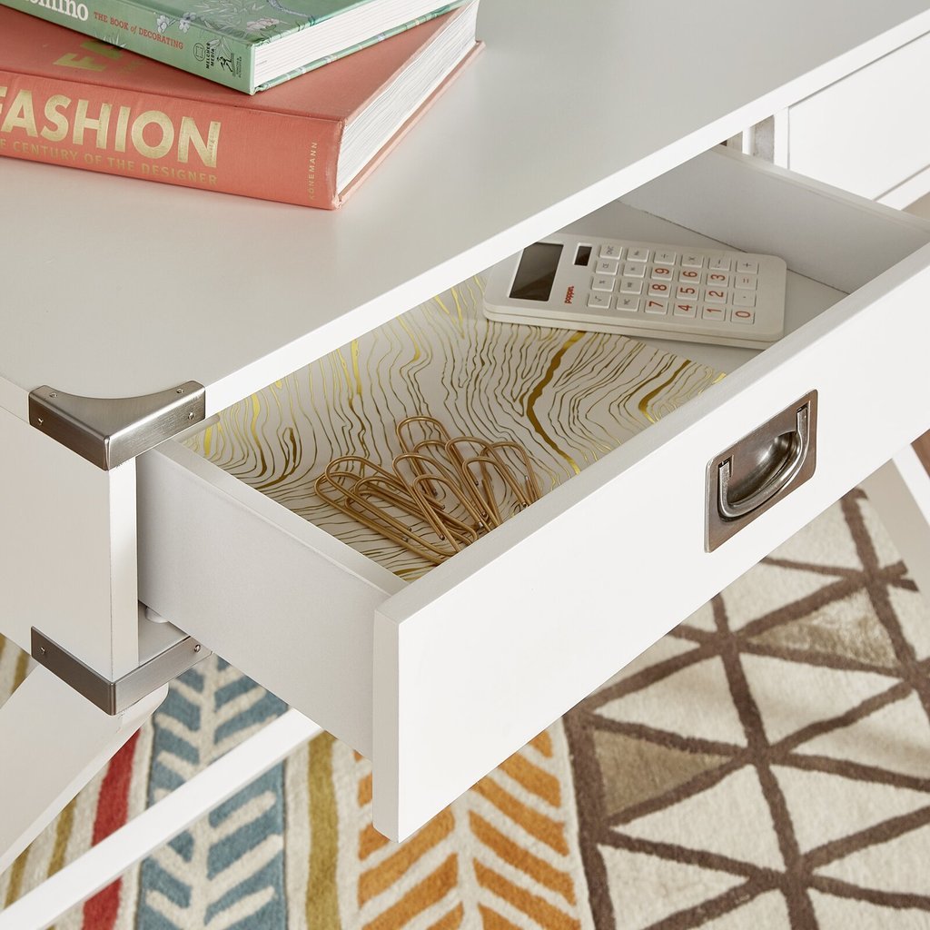 Консоль MORGAN WHITE от фабрики LOUVREHOME (Китай) — элегантное решение для современного интерьера. Лаконичный дизайн с четкими линиями и двумя вместительными ящиками дополнен металлическими ручками прямоугольной формы. Прочное крестообразное основание обеспечивает устойчивость, а универсальность модели позволяет использовать её как туалетный столик или письменный стол.