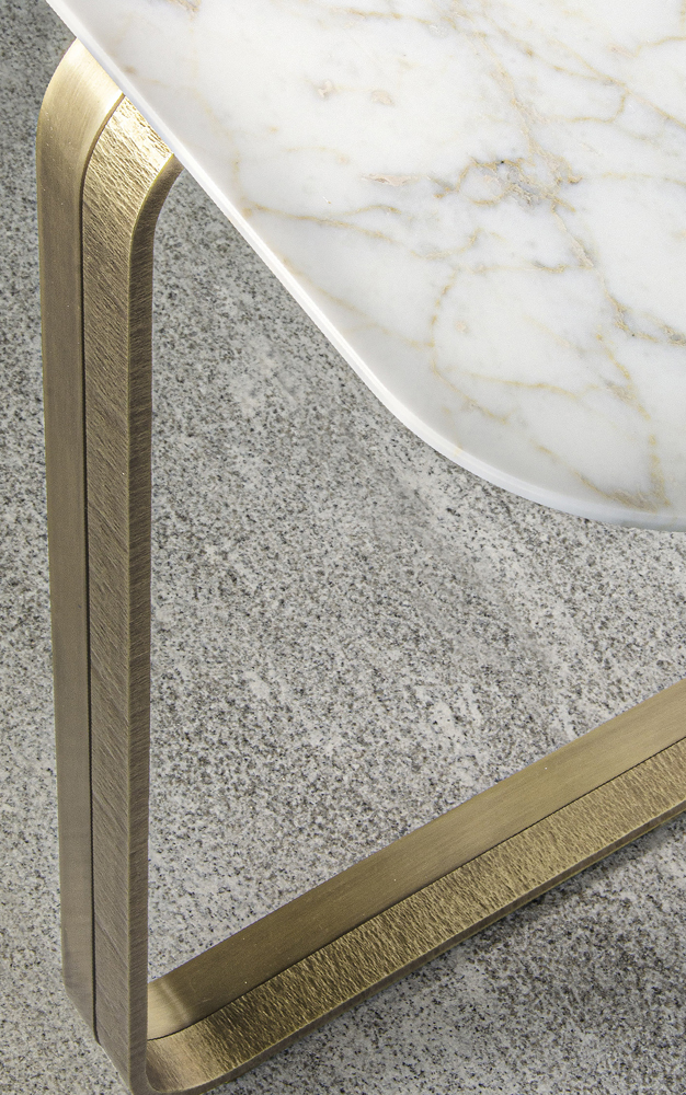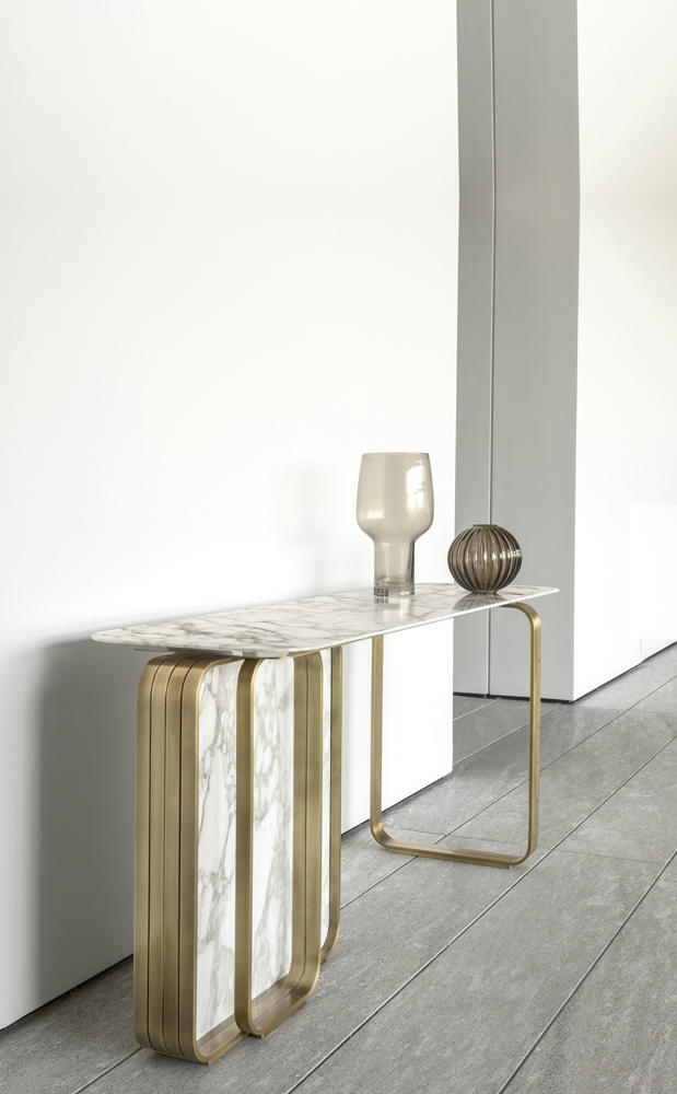 Консоль Nova отличается драгоценной металлической структурой, выполненной в форме кольца, которая обрамляет вертикальную мраморную плиту. Этот уникальный дизайн подчеркивает идеальный баланс между полными и пустыми объемами, создавая визуальное наслаждение и гармонию. Тонкая мраморная столешница с закругленными углами добавляет легкости и изяществу, делая каждое прикосновение к ней особенным.