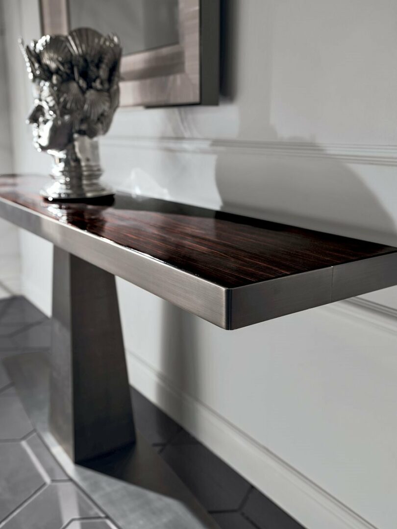 Консоль RIM выделяется своим авторским дизайном, который сочетает в себе элегантные линии и современные формы. Каждая деталь этой мебели создана с вниманием к мелочам, что делает ее не просто предметом обстановки, а настоящим произведением искусства. Изготавливаемая в различных отделках, таких как черный хром, матовое золото и глянцевый лак, консоль легко впишется в любой интерьер, будь то классический или современный стиль.