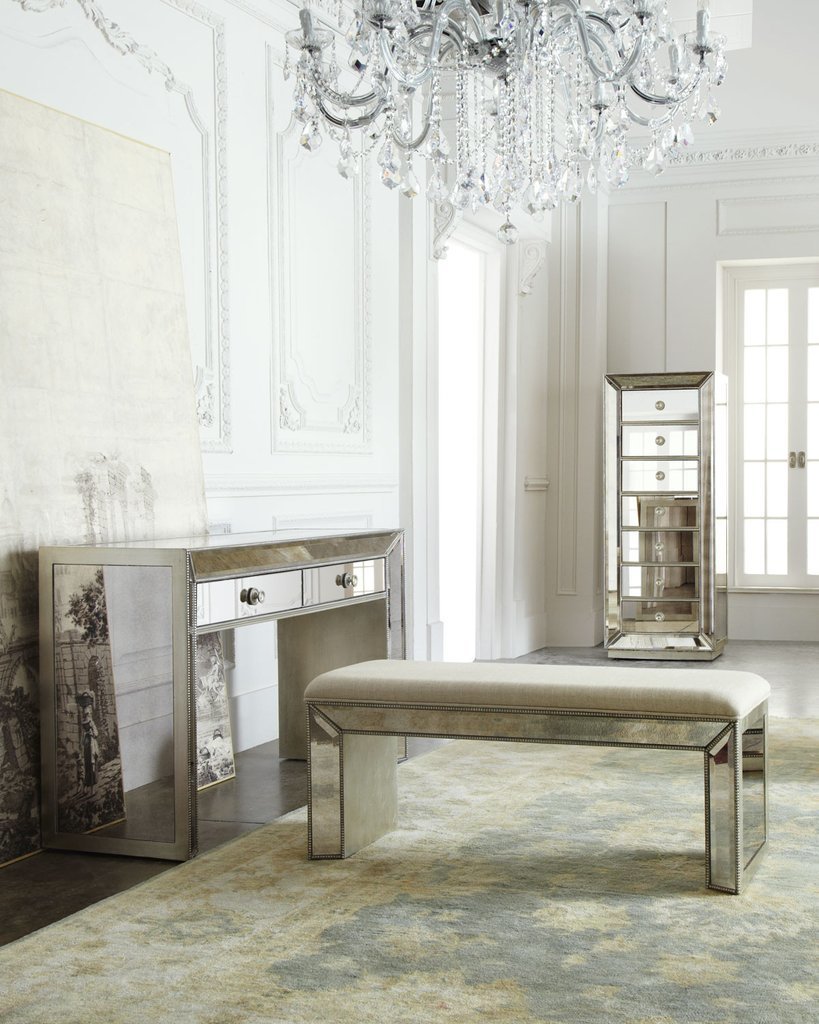 Модель с зеркальной отделкой и изысканным декором из бисера сочетает функциональность и стиль. Два просторных выдвижных ящика с бронзовыми ручками подчеркивают премиальный дизайн.