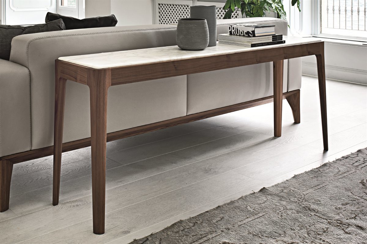 Изготовленная из массива ореха каналетта, она предлагает разнообразные варианты столешниц: дерево, мрамор или окрашенное стекло с кислотным травлением.