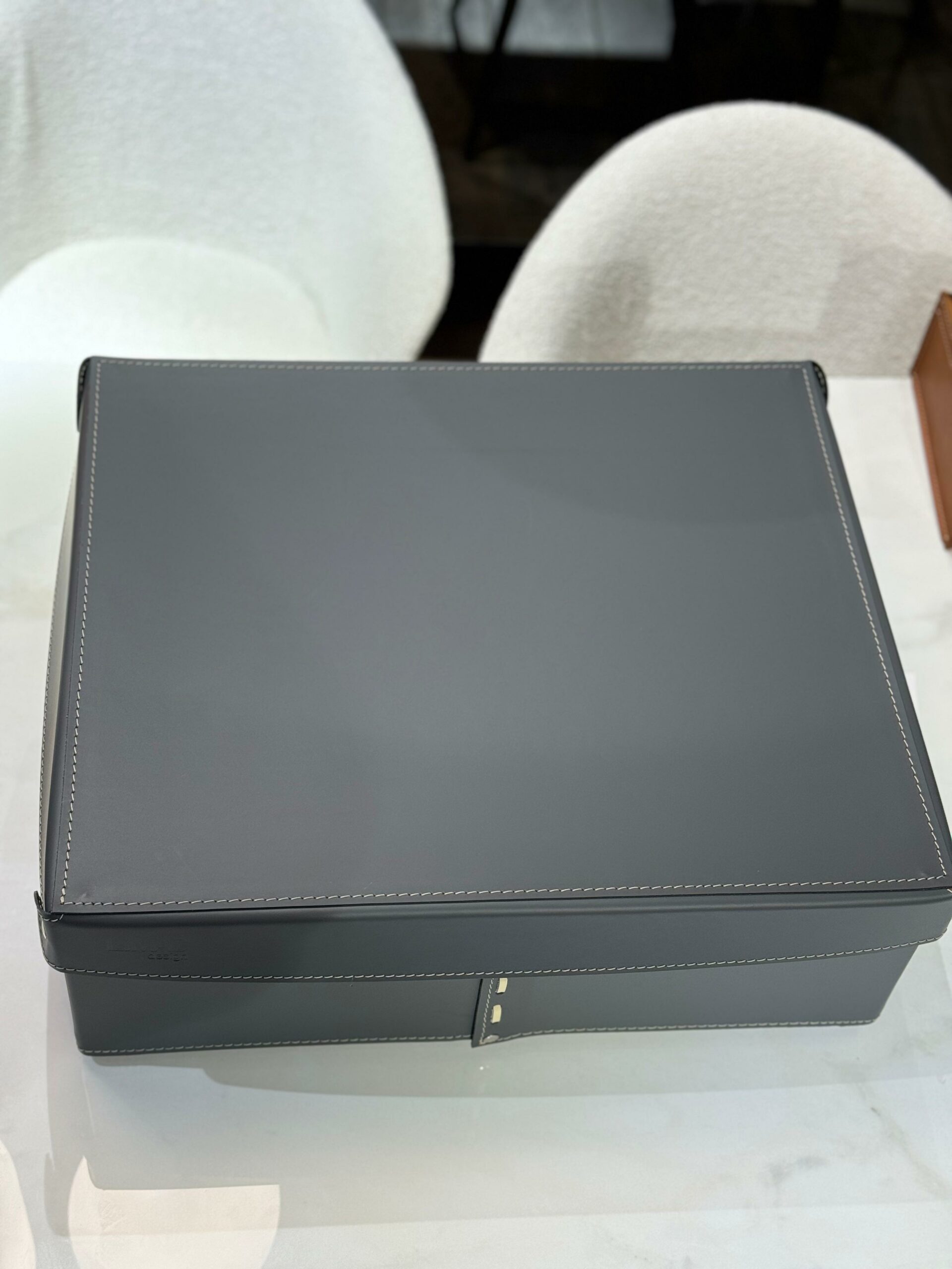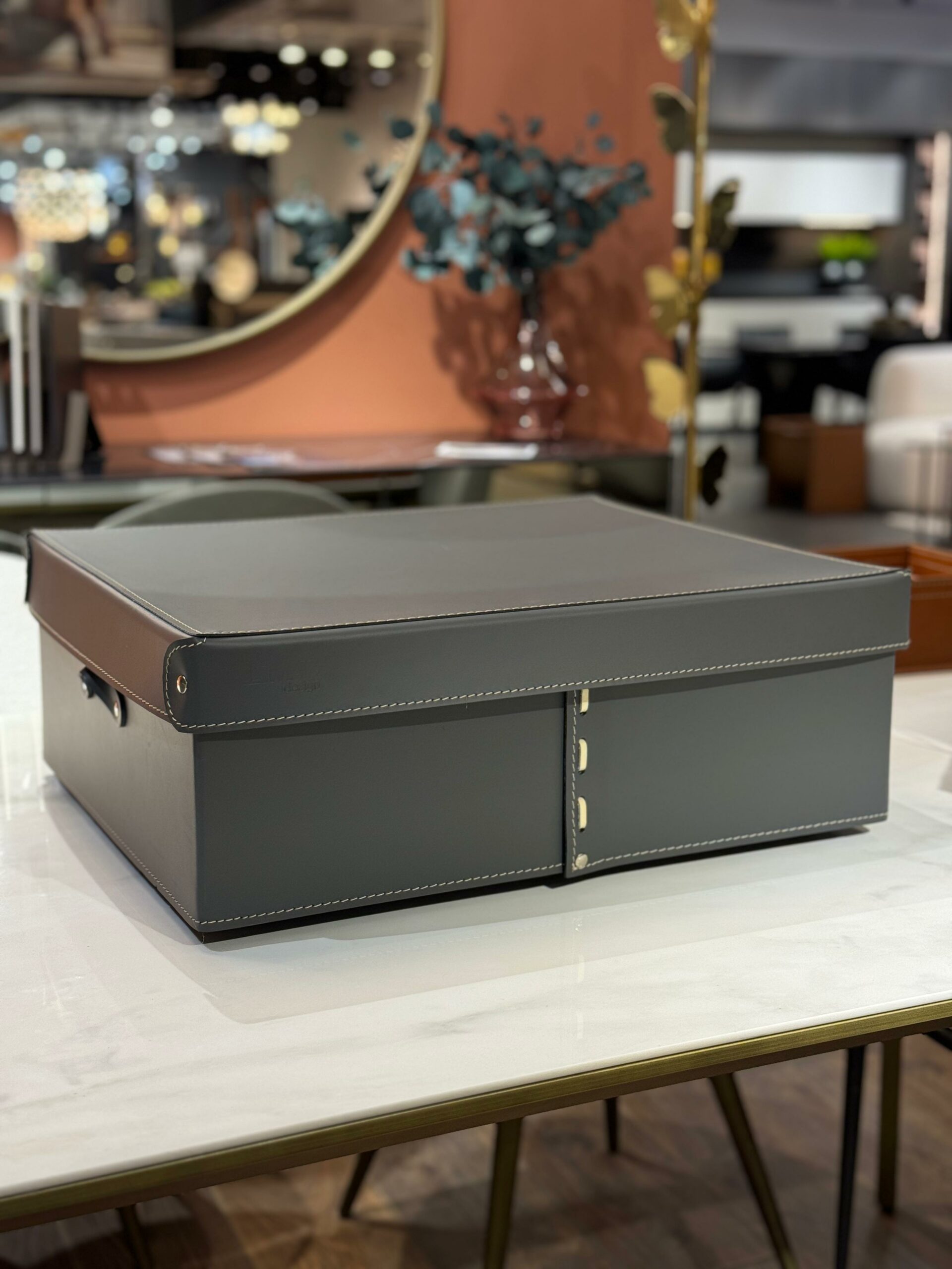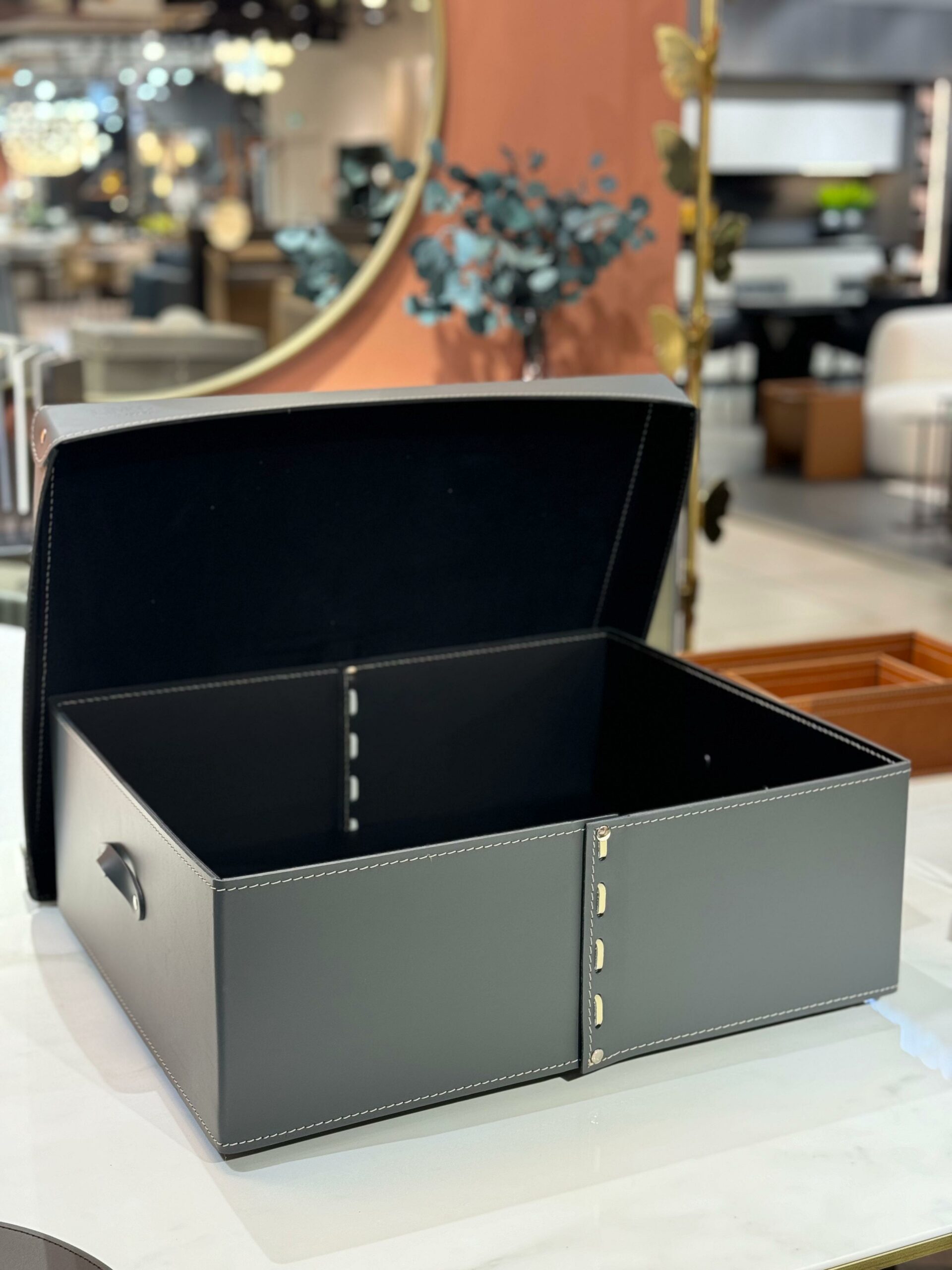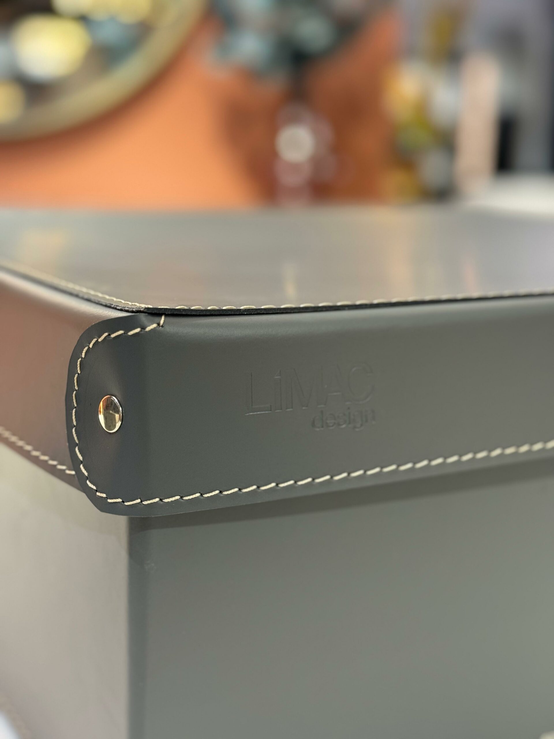 Коробка с крышкой из кожи 44*59*19 gray из натуральной плотной кожи от Итальянской фабрики LIMAC , которая производит аксессуары для дома из кожи.