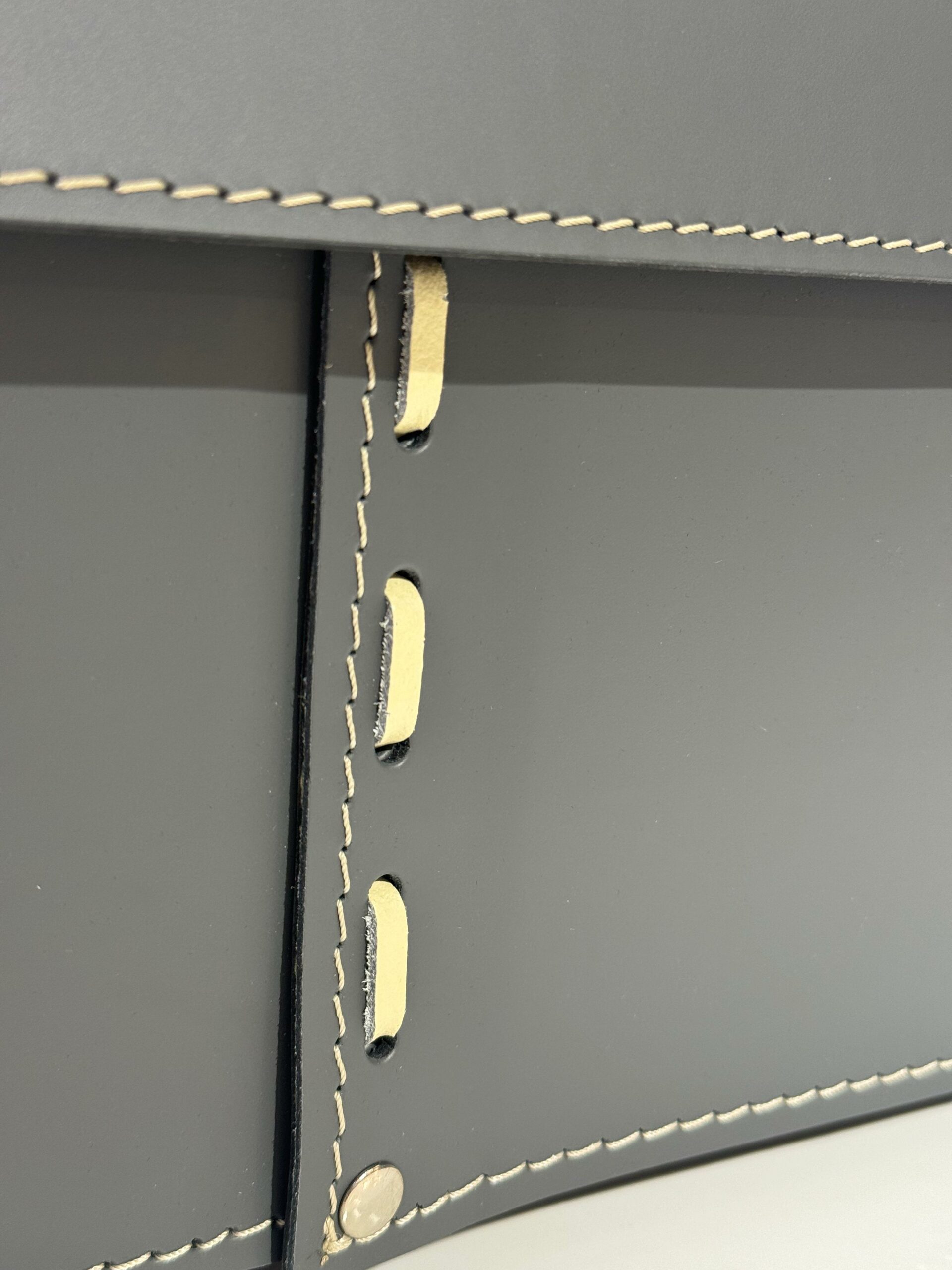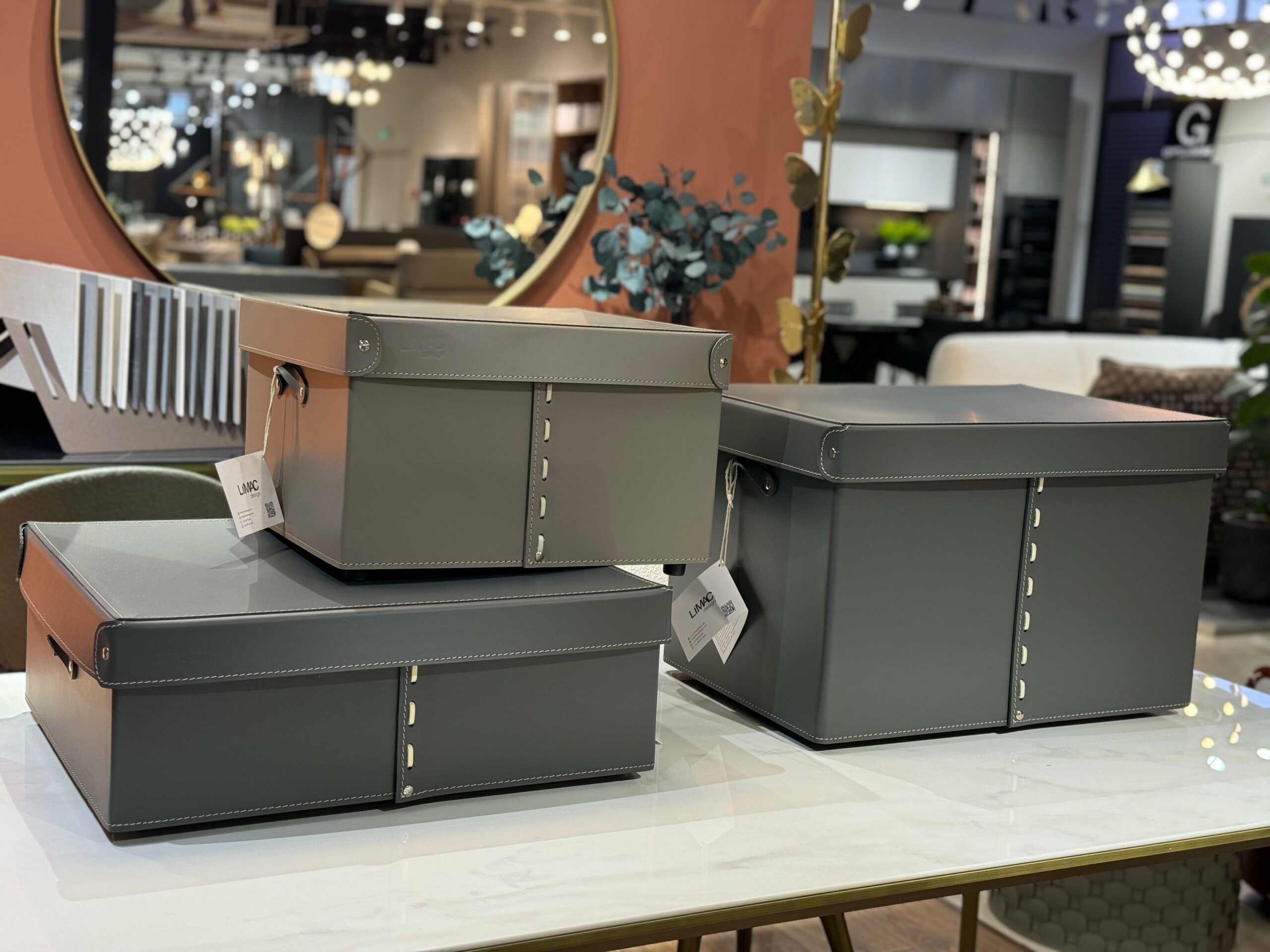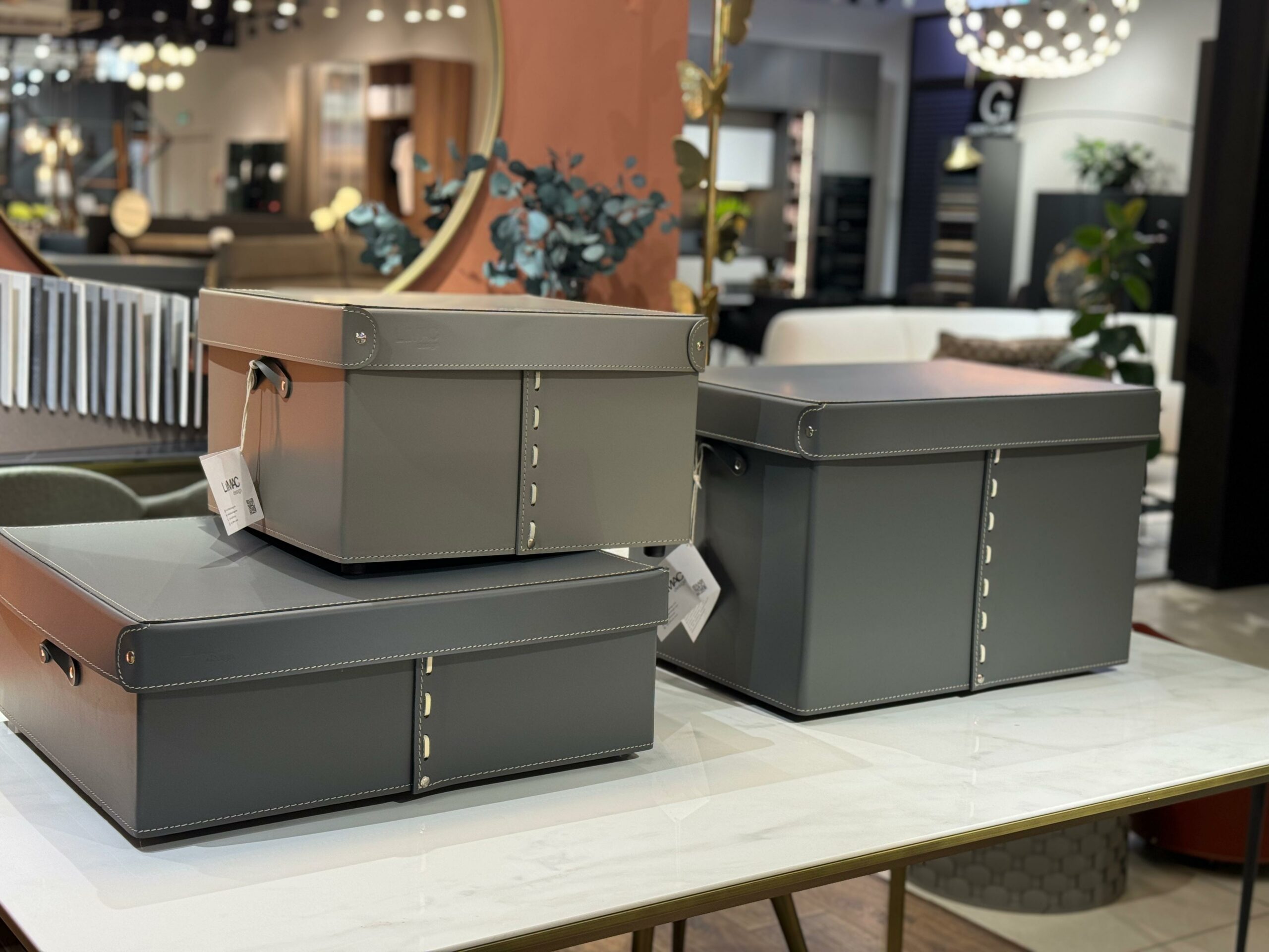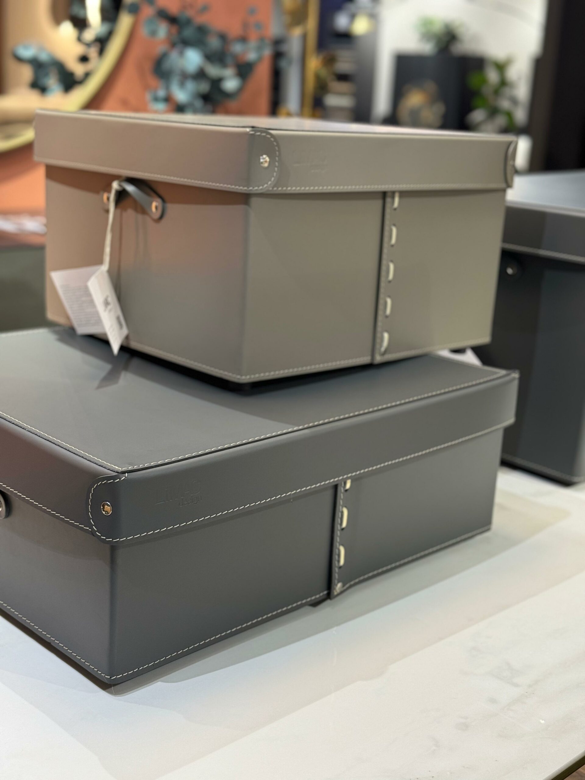 Коробка с крышкой из кожи 44*59*19 gray из натуральной плотной кожи от Итальянской фабрики LIMAC , которая производит аксессуары для дома из кожи.