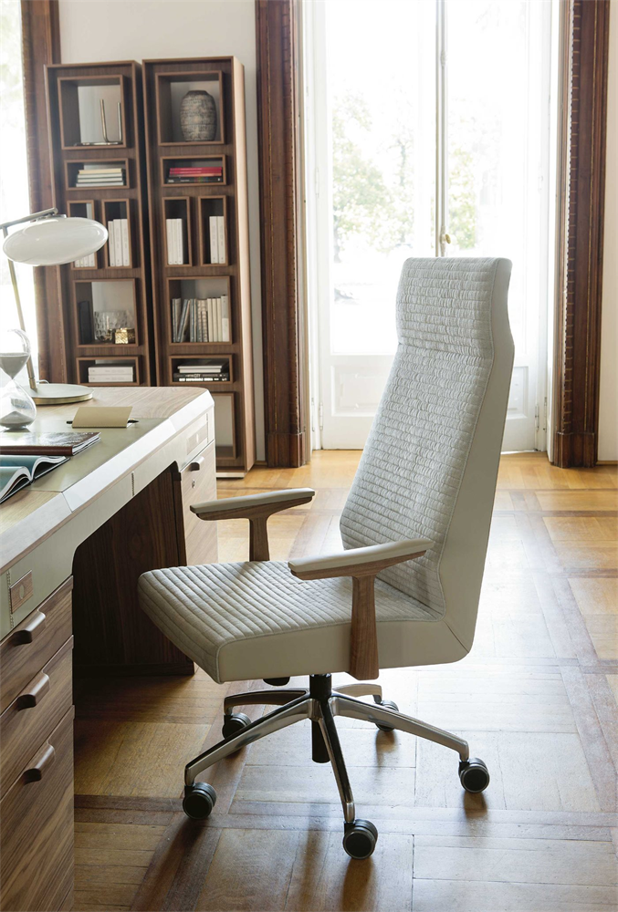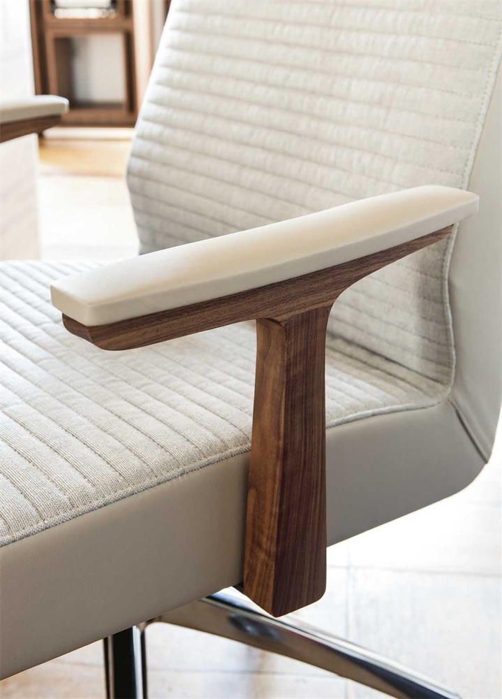 Каждая линия кресла Elis продумана до мелочей. Вращающееся кресло для руководителей имеет 5-спицевое металлическое основание на колесах, что обеспечивает невероятную мобильность и комфорт. Подлокотники из массива ореха каналетта придают креслу нотку тепла и уюта, создавая атмосферу, которая вдохновляет на продуктивную работу и важные решения.