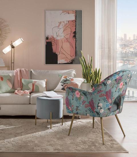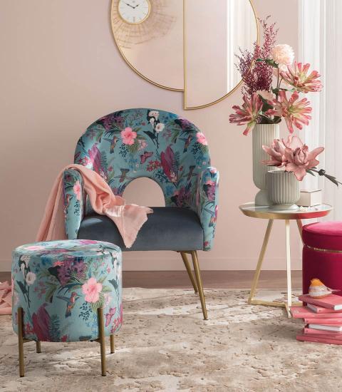 Кресло Flowers привлекает внимание своим красочным дизайном, который словно наполняет комнату жизнью и энергией. Его элегантные линии и гармоничные пропорции создают атмосферу уюта и романтики. Металлические ножки золотистого оттенка добавляют нотки современности и стиля, подчеркивая индивидуальность каждого элемента.